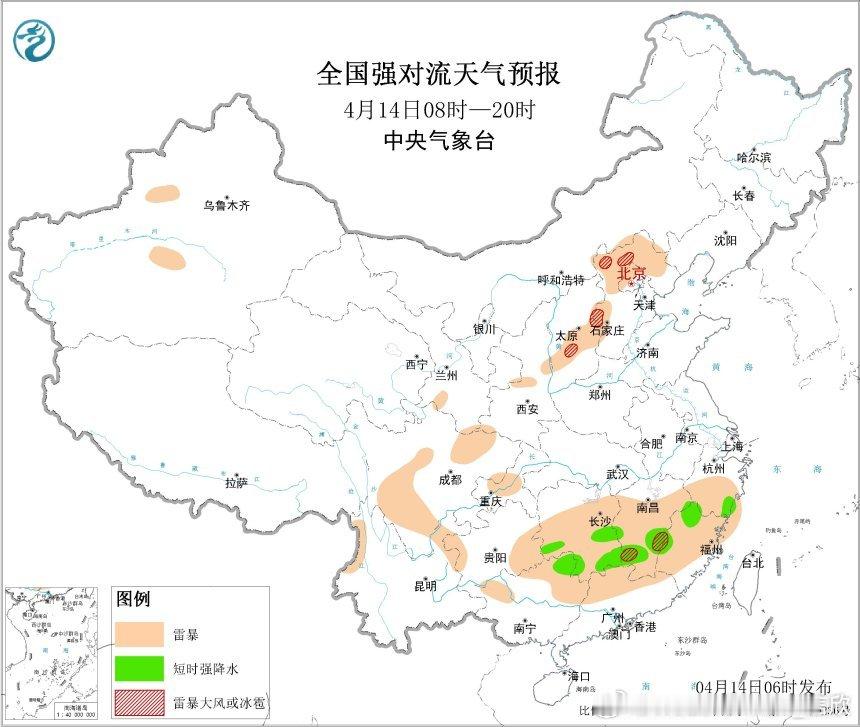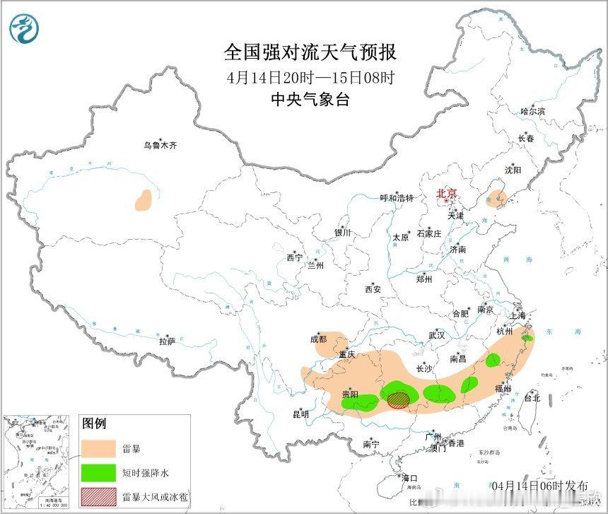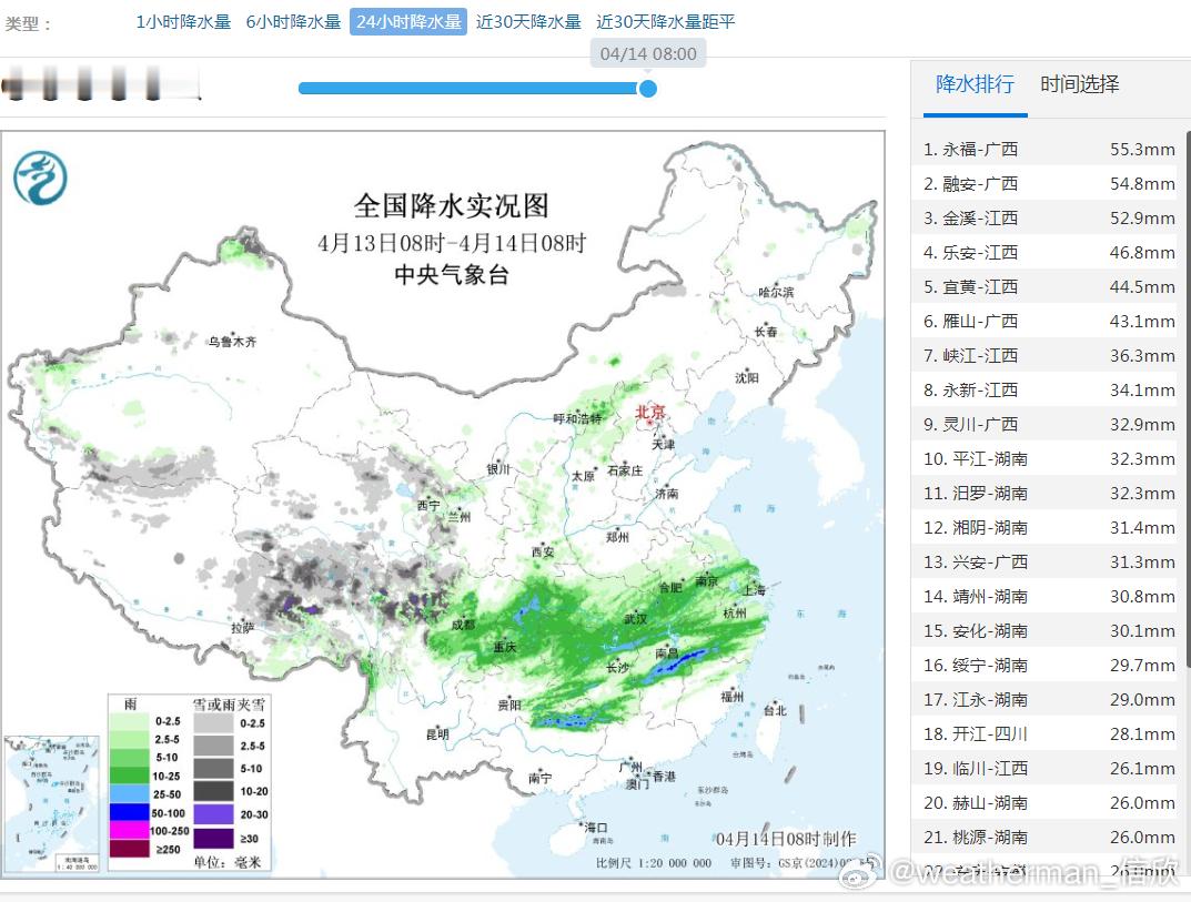 预计4月14日08时至15日08时,新疆北疆东部、西藏东北部、青海东南部等地部分地区有大雪(5~7毫米);江南中南部、贵州东南部、广西东北部、广东西北部、西藏东南部等地部分地区有中到大雨,其中,贵州东南部、湖南南部、江西中部、广西东北部等地局地有暴雨(50~70毫米)。