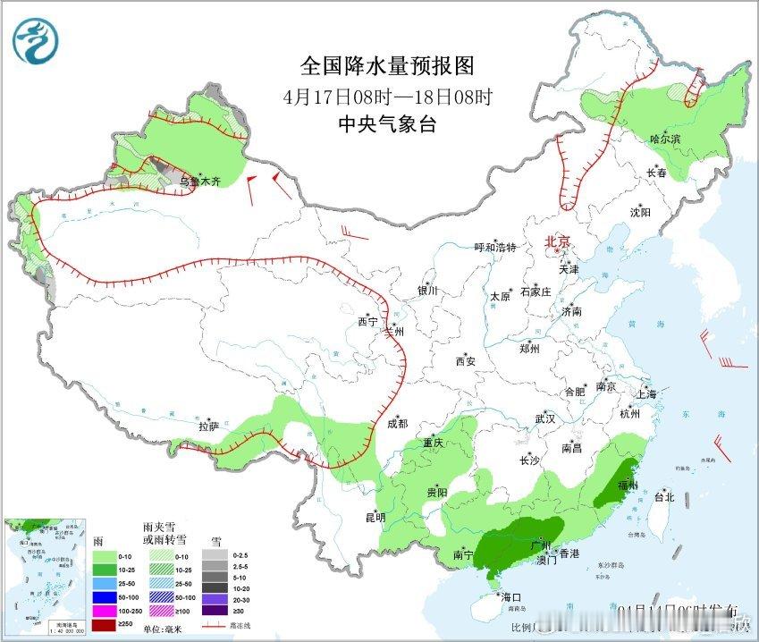 预计4月16日08时至17日08时,新疆北疆北部等地部分地区有中到大雪,局地暴雪(10~13毫米);江南大部、广西、广东西北部、四川盆地南部、内蒙古东南部、河北北部、吉林西部等地部分地区有中到大雨,其中,广西西南部等地局地有暴雨(50~60毫米)。