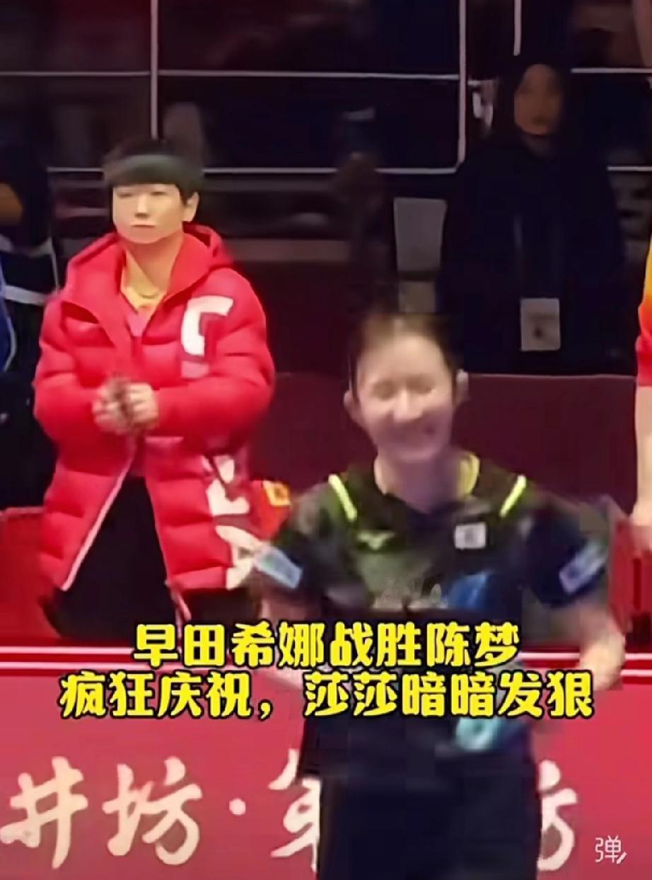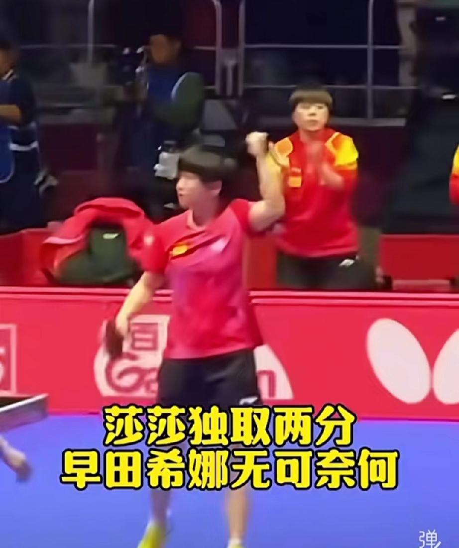 曾经找师傅要表扬的莎莎好开心。 第一场莎莎打了美和3:0,就这样举着手势去后台,找夸奖,这表情太萌了。 师傅看到莎莎这小表情也举出大拇指点赞! 没想到,后面队友输了,莎莎还要上战场。 在旁边把暖手宝搓出火气的莎莎,走路带风,最后3:1早田希娜,莎莎独砍2分,守住金牌,好样的!