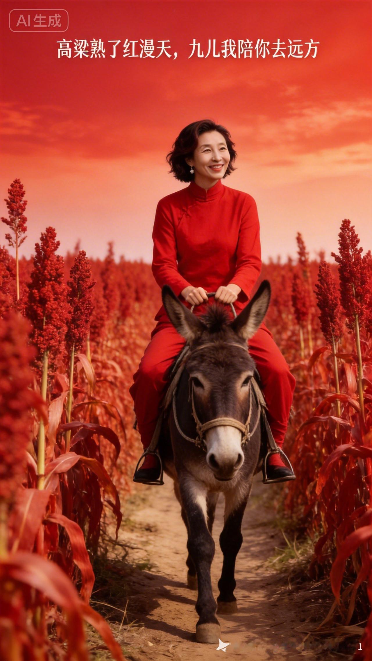 红衣女子骑驴田间行,岁月静好,诗意生活。