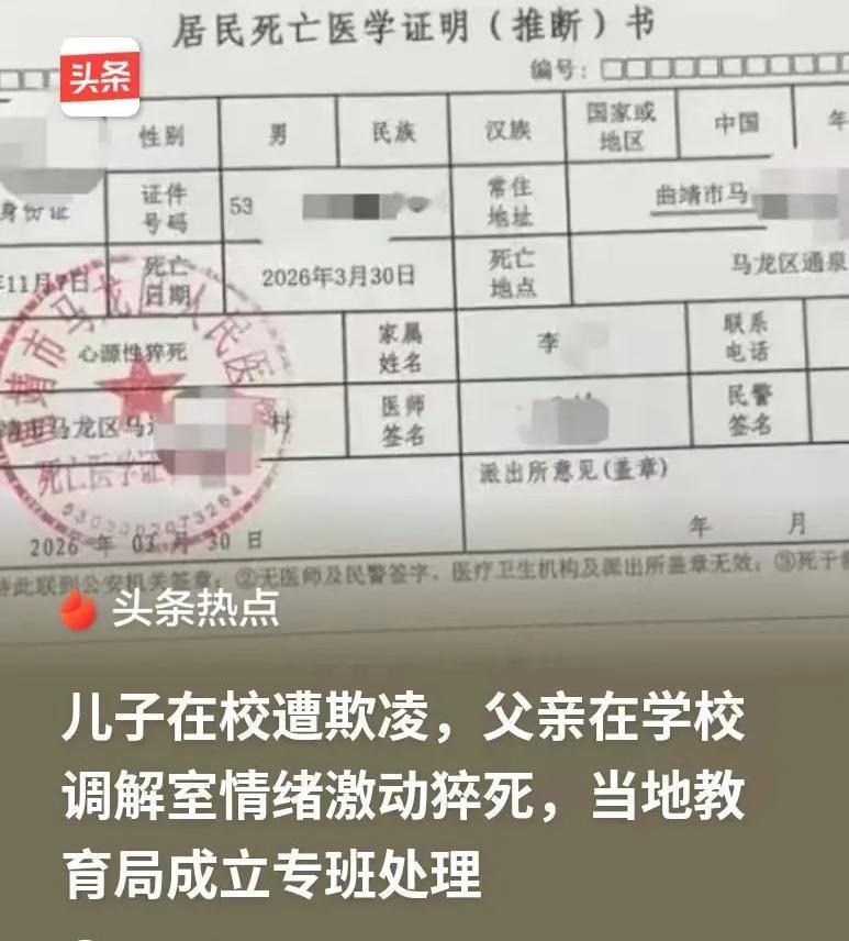 学校初期开始就遭受霸凌的学生是家中独子,父亲今年49岁,他15岁,父亲在34岁时家里才有了他,自此他就是父母眼中的宝贝。就是这样一个自己都舍不得打,捧在手心怕摔了,含在嘴里怕化了的孩子,遭受了学校的霸凌。 父亲得知情况后,和妻子来到学校讨要个说法,没想到因为激动心源性猝死,当着妻儿的面倒了下去。 3月30日这天,夫妻慌忙两个来到学校,因为他们的儿子被打了。到学校了解后,从学期初孩子就被其他同学索要零食索要财物,处于被霸凌的状态。 没想到刚到调解室没几分钟,要为儿子讨公道的他,倒了下去。 虽然学校配备AED,但没有人会使用,错过了抢救的黄金时间。 至今两周过去了,还没有说法。 妻子认为虽然丈夫长时间吃降压药,但是如果不是孩子被霸凌,怎么会情绪激动,这是根源。 其实这说法也没错,学校逃避不了责任。 第一,学生在学校受到霸凌,而且是长时间的霸凌,学校没有发现没有及时处理,属于管理疏漏 第二,学校配有AED,这可是关键时刻能救命的设备。可学校没有人会用,安全培训不到位,没有突发事件的应急预案,安全工作流于形式。 不管怎样,学校有一定的责任。 可惜了一名9年级的孩子目睹父亲的最后一刻,家里的顶梁柱没了,对于即将的中考有没有影响。 希望霸凌者能受到处罚,这名学生早日走出阴影,学校也能给家属一个交代。