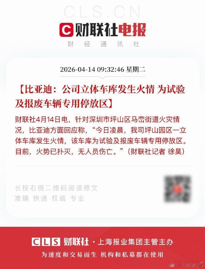 比亚迪回应深圳车库火灾 今日凌晨,我司坪山园区一立体车库发生火情,该车库为试验及报废车辆专用停放区。目前,火势已扑灭,无人员伤亡。看到无人员伤亡,真是不幸中的万幸。