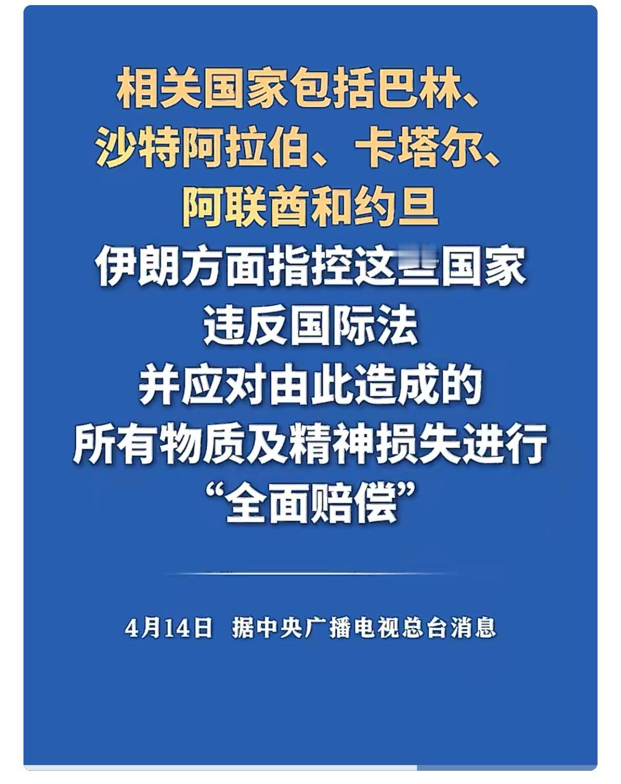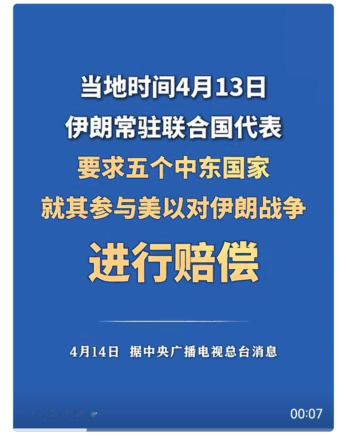 据央视新闻报道,当地时间4月13日,总台记者获悉,伊朗常驻联合国代表要求五个中东国家就其参与美以对伊朗战争进行赔偿。据了解,相关国家包括巴林、沙特阿拉伯、卡塔尔、阿联酋和约旦。伊朗方面指控这些国家违反国际法,并应对由此造成的所有物质及精神损失进行“全面赔偿”。网友们把波斯猫这行为做了一个贴切的比如:中东五个富豪花巨资请了一个超级保镖,超级保镖和波斯猫约架,炸了波斯猫13000个目标,还有很多人员伤亡。现在打架的双方暂时停火,波斯猫找上门来,要求五个富豪赔损失。理由就是“雇主连带责任”,因为雇主没有把保镖约束好,放任保镖四处去打架。波斯猫这一手生意经玩的溜,让人服气。