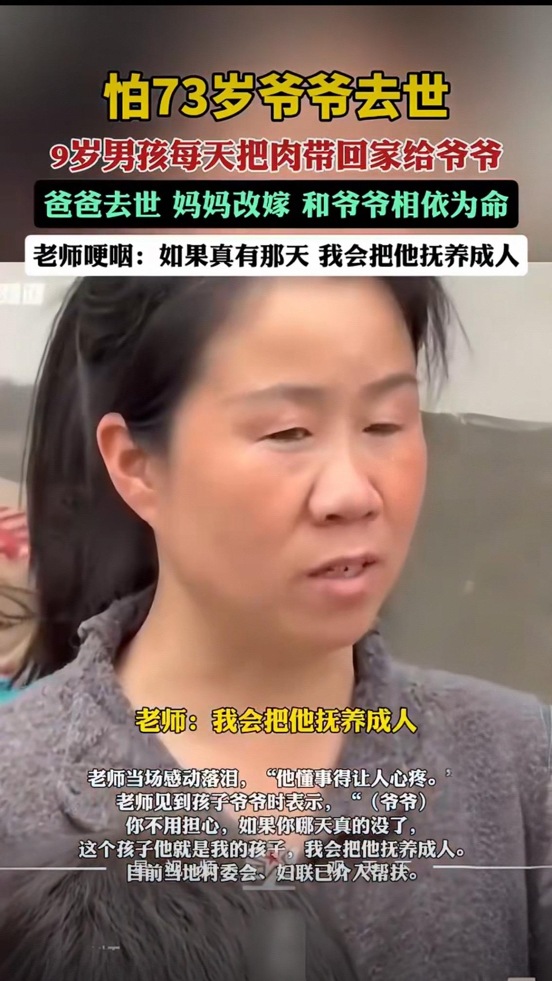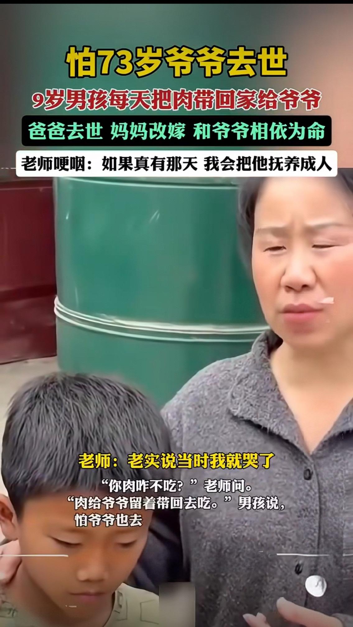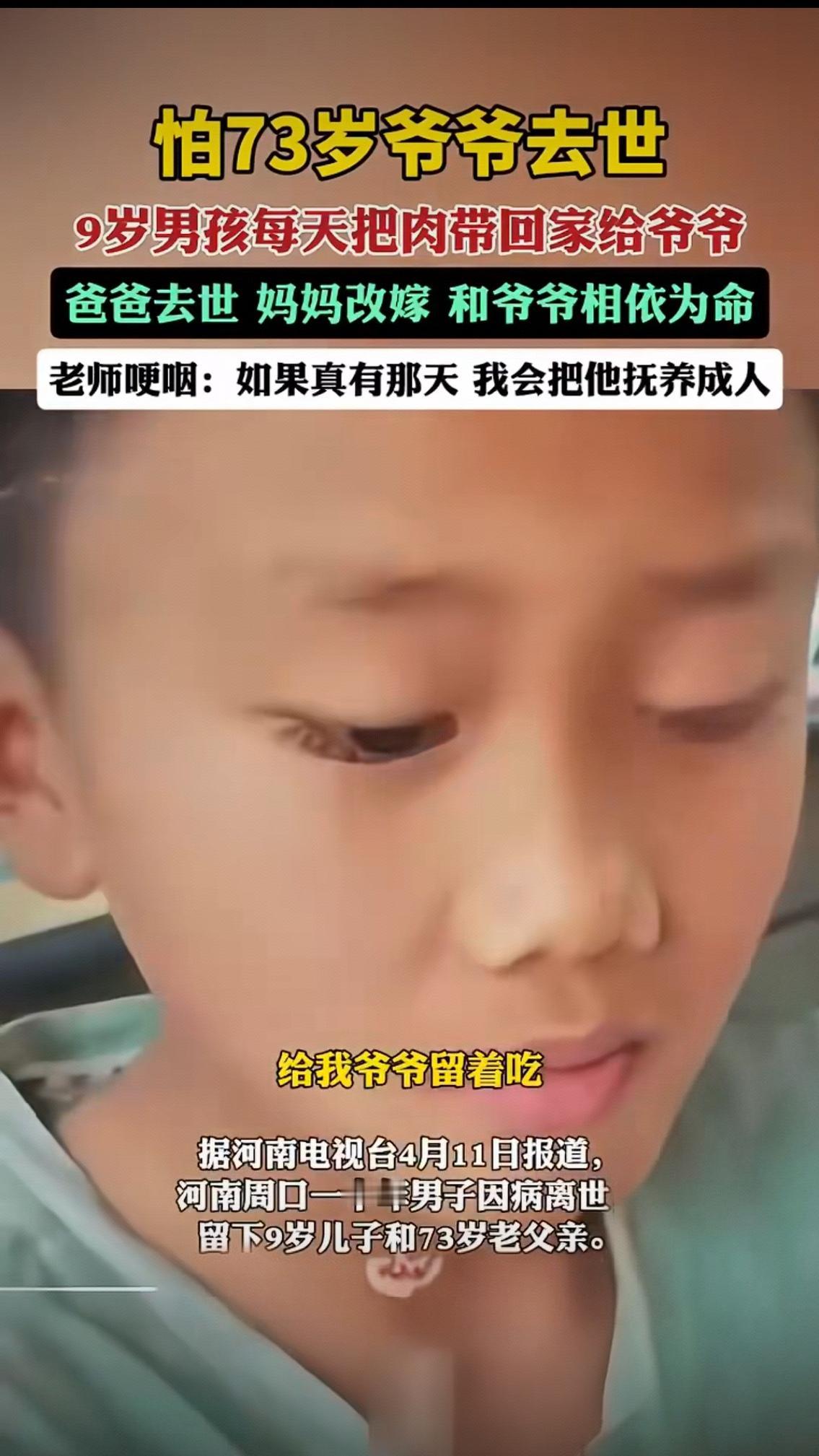 令人心疼!小小年纪,本该无忧无虑撒娇玩耍,9岁的他却早早扛起了不属于童年的沉重牵挂。父亲离世、母亲改嫁,偌大的世界里,爷爷就是他唯一的依靠,也是他全部的温暖。孩子心里清清楚楚,爷爷已经73岁,岁月无情,他最怕的事情,就是至亲突然离去。 所以每一天,他都小心翼翼珍藏饭菜里的肉,不舍得自己吃,一路小心翼翼带回家,全部留给年迈的爷爷。别人的孩子挑食厌肉,他却把每一块肉都当成珍宝,那不是普通的饭菜,是孩子笨拙又深沉的孝心,是害怕失去亲人的惶恐,是孤苦岁月里最纯粹的温柔。 没有父母庇护,祖孙二人相依为命,日子清贫又孤单。别的孩子有人疼爱呵护,他早早学会懂事隐忍,默默承受离别带来的不安,日夜担忧爷爷老去。小小的身躯藏着大大的心事,稚嫩肩膀扛着无人诉说的心酸,懂事得让所有人心疼落泪。 老师看在眼里疼在心里,深知孩子无依无靠的苦楚,也读懂孩子日夜煎熬的恐惧。含泪郑重承诺:倘若真有最坏的那一天,绝不会让孩子孤苦无依,一定会拼尽全力把他抚养成人,做他永远的后盾。 人间最苦是年少失亲,最暖是世间善意。孩子用孝心守护爷爷,陌生人用温柔守护孩子。命运虽薄待这个小男孩,可世间温情从不缺席。 谁能不心疼这个懂事到让人心碎的孩子?愿老人平安长寿,愿孩子被世界温柔以待。 你愿意为这个可怜又孝顺的小男孩,留下一句祝福吗?令人心疼的事件 懂事的孩子令人心疼