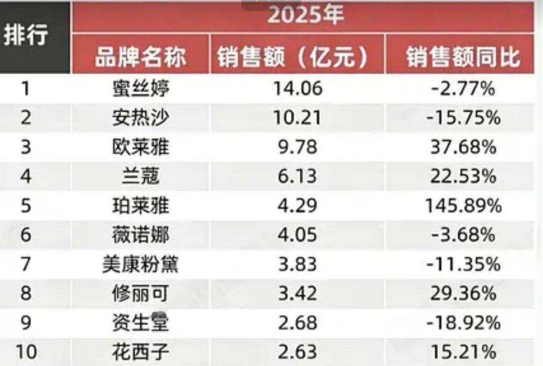 2025防晒销售额前十,刘亦菲代言的珀莱雅同比增长好多。