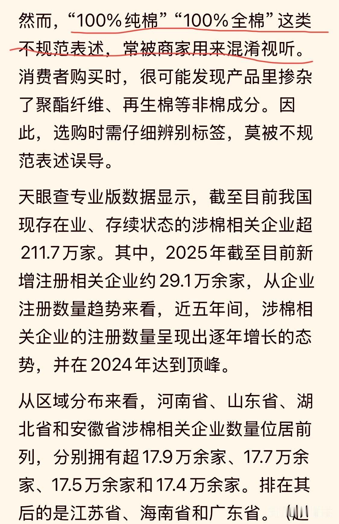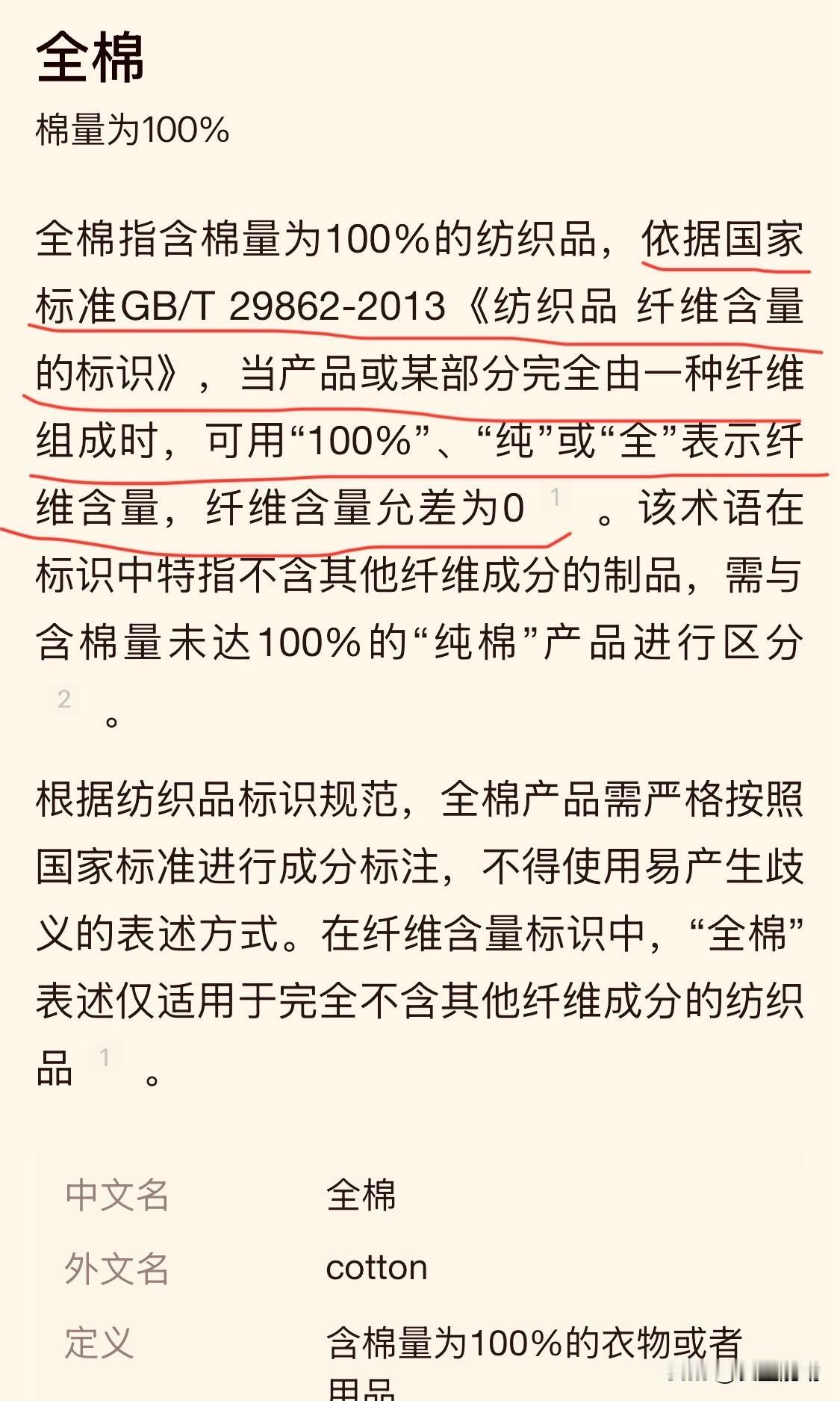 消费陷阱:“100%纯棉”是真的全棉产品吗?结果可能颠覆您的认知 最近,环球网发出一份报道,标题是“原来100%纯棉不是棉”……看到这样的标题,我是挺震惊的——“100%纯棉”竟然不是棉,那是什么? 到这个疑问,我也查询了一下资料,尤其是国标GB/T29862-2013,标准里面明确规定:仅有“100%棉”“棉100%”“纯棉”“全棉”四种标注是合规的。其它标注都是不合理的,诸如“100%纯棉”、“纯正长绒棉”、“全棉100%”等等,都是不合规的,可能里面都没有棉花成分。 事实上,标准定义很清楚,依据国家标准GB/T 29862-2013《纺织品 纤维含量的标识》,当产品或某部分完全由一种纤维组成时,可用“100%”、“纯”或"全”表示纤维含量,纤维含量允差为0。 另外,对于某些产品如服装,全棉可以是“95%的棉+5%其它(如氨纶)”,因为线材、装饰不一定是纯棉。所以有的吊牌标注“95%棉+5%氨纶”。 以后大家购买棉质衣服时要注意了,可千万别被忽悠,一定要认准“100%棉”“棉100%”“纯棉”“全棉”四种规范性标注。纯棉知识 全棉百分百棉 全棉100棉 百分纯棉 面料真相 纯棉体验