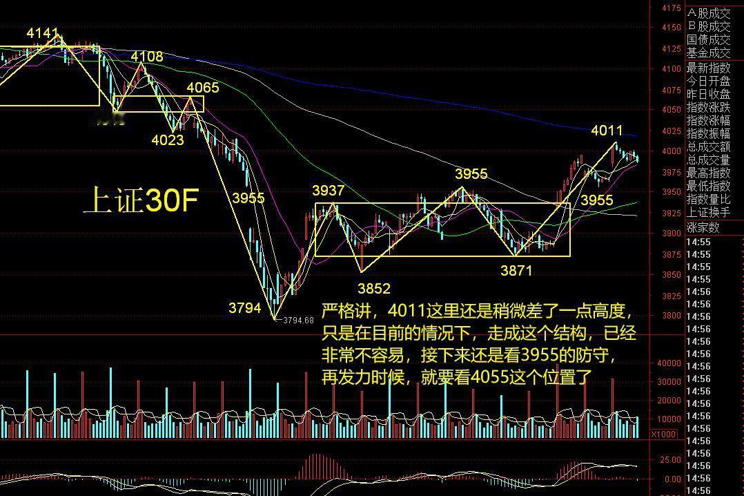 缠论看市场 又是一个见微知著的过程,4月7日提到的积极信号, 终于在今天算是开出一朵花了 其实今天的走势很漂亮,稍显遗憾的是高点到了4011,如果再多2个点, 就可以得90分了,不过,这样也不错,结构很好,早盘就直接冲高,先前 念叨的4002被突破,然后震荡回调,这个是正常和预料中的。 在1F线段结构上,高位形成了中枢,这也预示这个位置短线基本到位, 接下来围绕这个高位中枢如何发展,就是核心了。这就是缠论很方便 的地方,只要有中枢,分析就会很直观。 从防守上看,只要3955不破,那么都算强势的震荡,而强势震荡后再次 冲高的高点,决定这个行情能走得多强,其实很好分析,4055可以作为 目标位了,也即是前面中枢的下沿,如果消息面配合,冲上去也不太难的。 今天就说这么多吧,从4月7日看到3876带来的积极信号开始,到今天也算 顺理成章,因为这几天没有出现再次趋弱的信号,没有趋弱,当然会逐步 演变出更多的强势走势了,到今天收盘,这个趋势都还在延续中,所以对 下周有点小小的期待。 图1: 1F线段上,高位的中枢在形成,这是下周要看的重要参照 图2: 30F结构上,离开中枢的走势在持续中,很清晰的结构