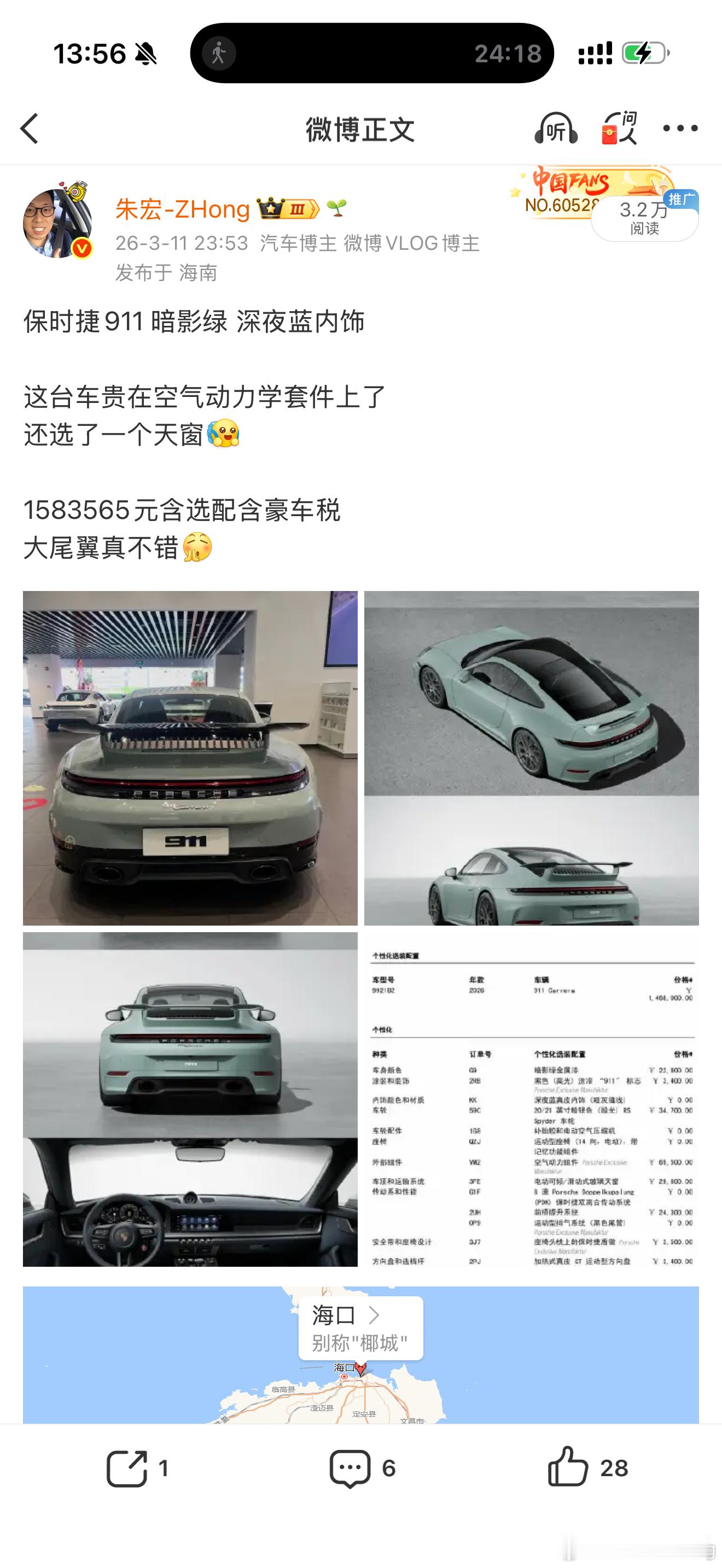 保时捷911 上个月在海南发过一次总价1660200元现在全款1539999元