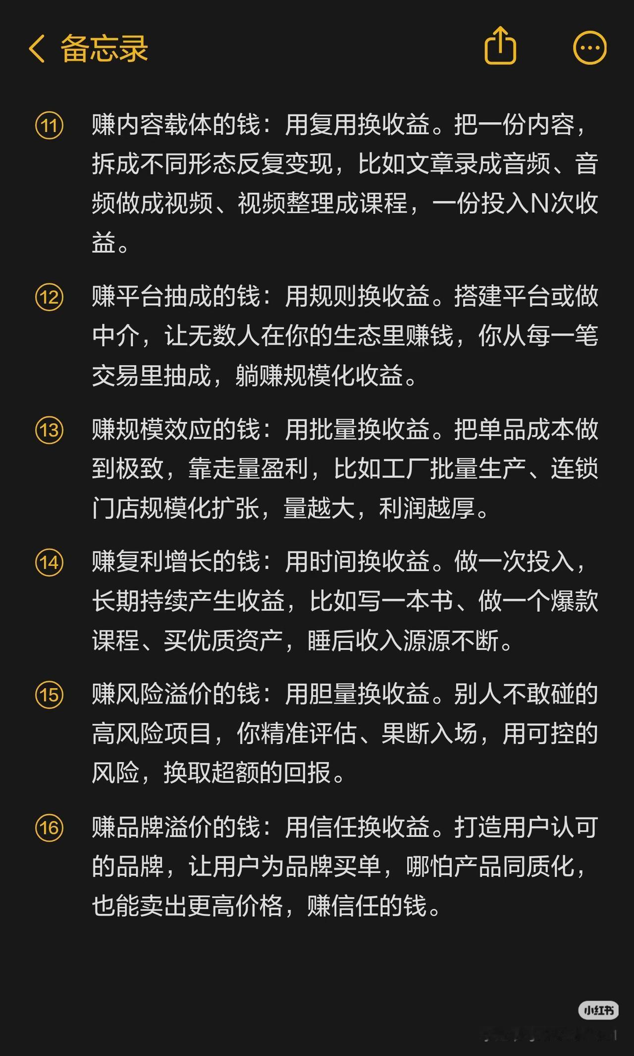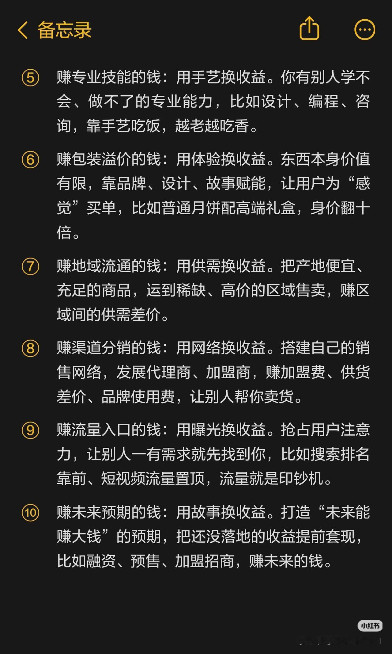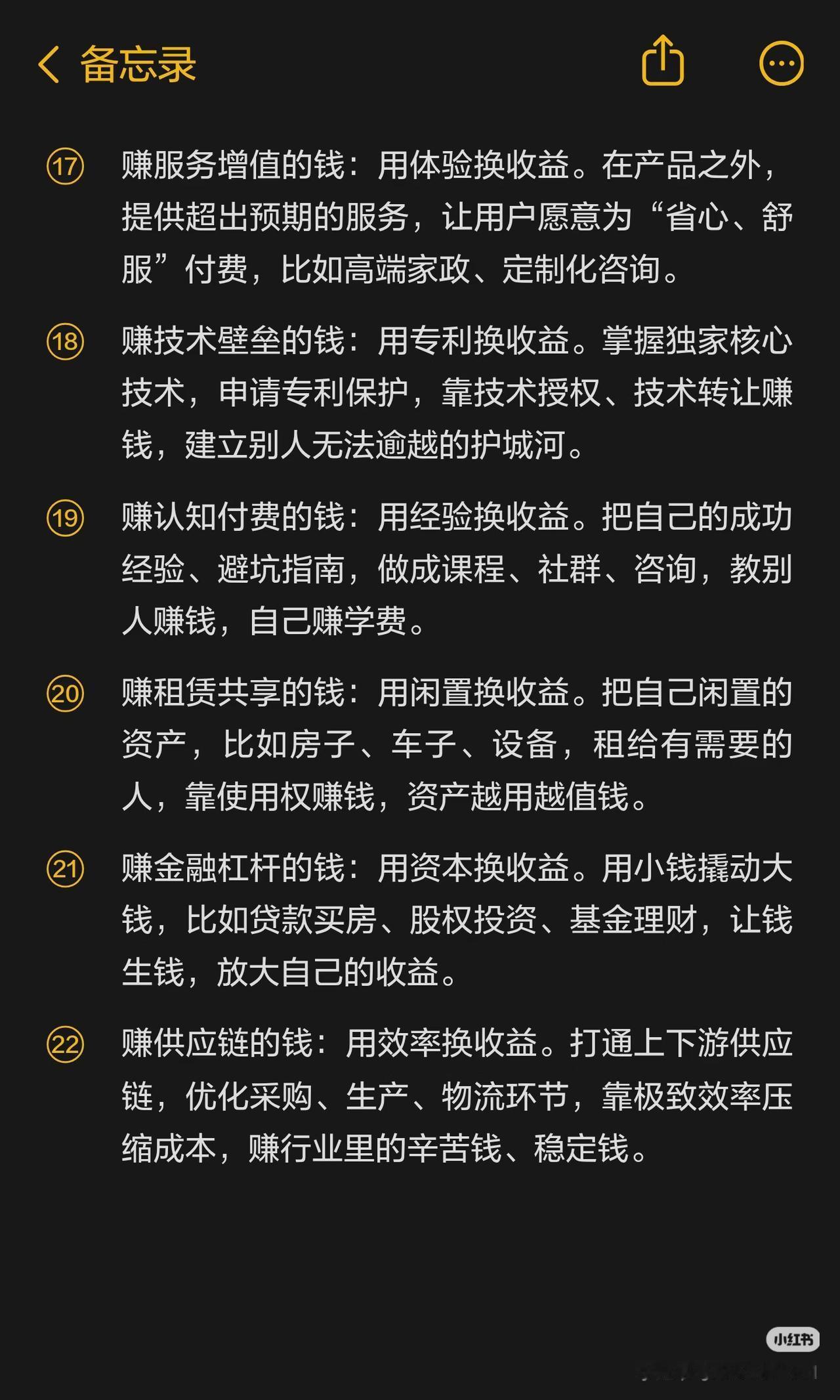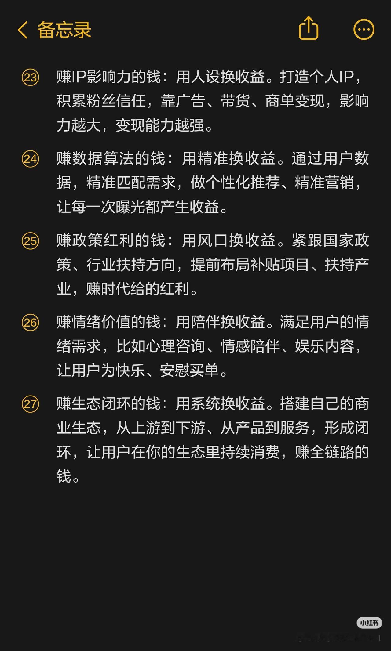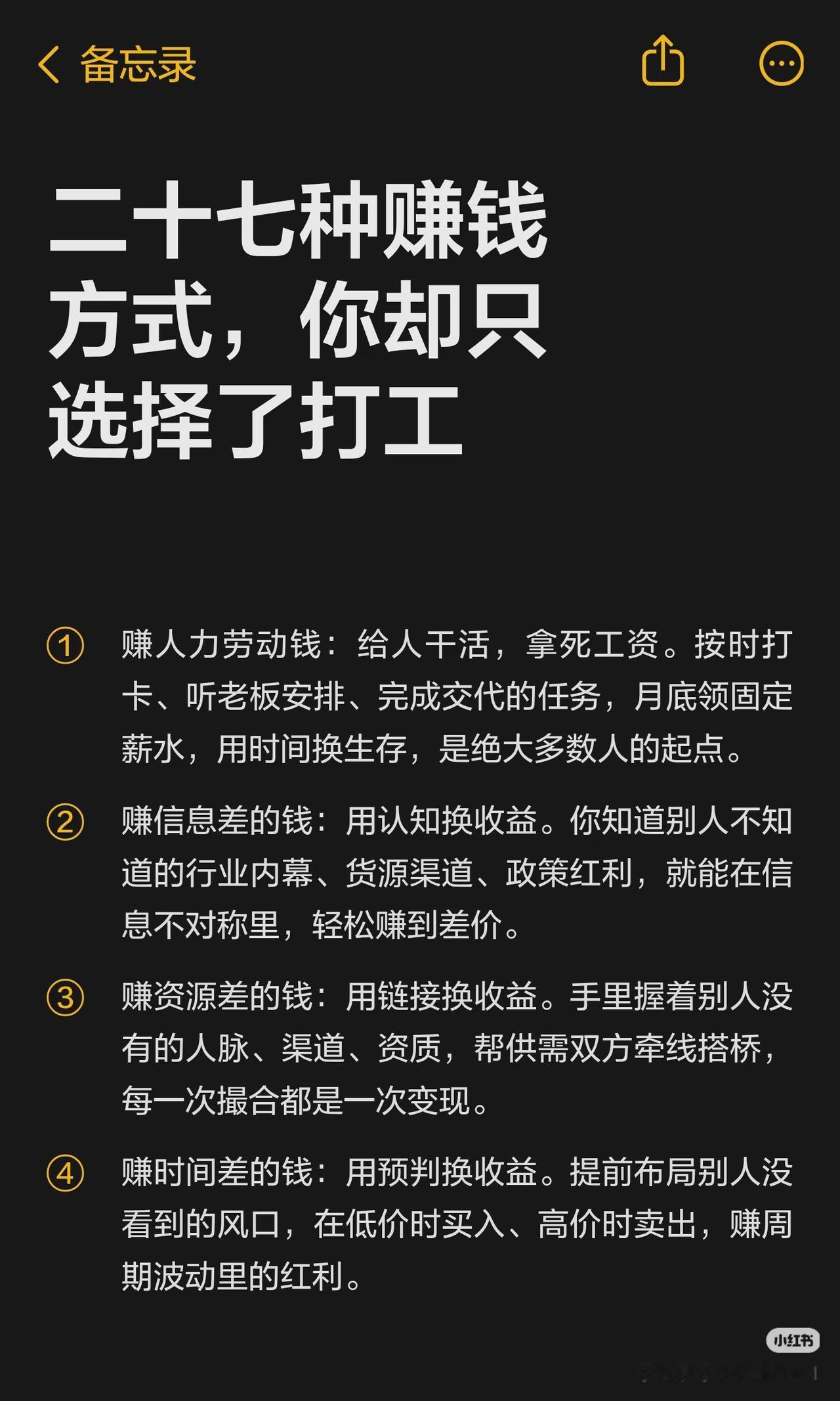 救命!原来社会上赚大钱的逻辑,全藏在这27条里了! 为什么有人天天躺平还日进斗金,你却埋头打工还被房贷车贷压得喘不过气? 不是你不够努力,而是你只盯着“用时间换钱”的死胡同,却忽略了剩下26种普通人也能上手的赚钱底层逻辑! 这张图里的27种赚钱方式,把赚钱的本质扒得底裤都不剩: 从最基础的赚人力劳动钱(打工),到靠认知差的信息差、靠资源的资源差、靠时间差的低买高卖; 再到进阶的专业技能、品牌溢价、IP影响力、生态闭环; 甚至还有金融杠杆、政策红利、数据算法这些高阶玩法。 原来赚钱从来不是“拼命干活”,而是换赛道、换思维、换维度。 你以为是选择了打工,其实是被“打工思维”困住了! 这27条逻辑,不管你是上班族想搞副业、创业者找方向,还是宝妈想盘活闲置资产,都能找到适合自己的那一条。 别让你的认知,限制了你的财富! 赶紧收藏转发,慢慢研究,改变命运的机会,可能就在这一篇里! 评论区聊聊,你目前靠哪种方式赚钱?想突破哪一层逻辑?👇 搞钱思维 副业 赚钱逻辑 认知提升