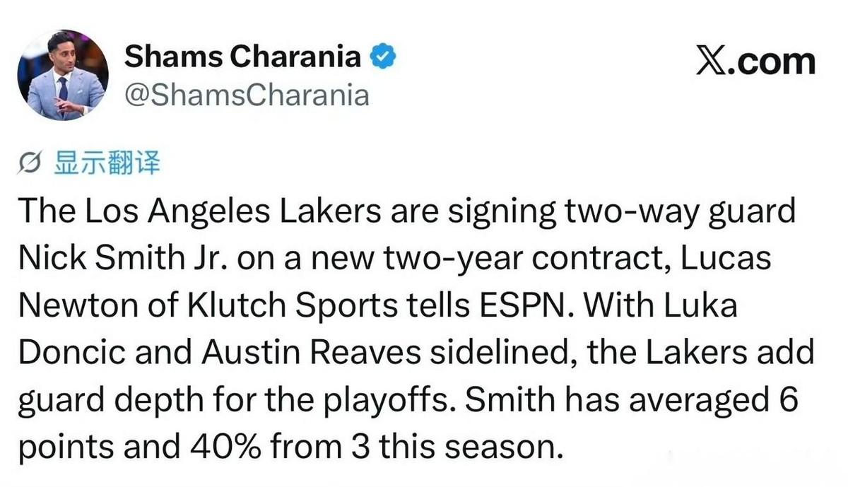 转正啦!!!湖人两年合同签约尼克-史密斯! 根据记者Shams最新消息透露,湖人在裁掉巴夫金之后,终于做出了最终决定,把这最后一个宝贵的名单名额,砸给了这位外线小将。 紫金军团为什么这么干? 现实原因很简单:外线实在太缺人了。 眼看马上要去拼刺刀打硬仗,可里夫斯等主力轮换的状况还悬着。球队急需找个能投篮的救火队员来撑场子。 小史密斯能上位,看着像是撞了大运。 但你翻翻他的常规赛数据:百分之四十的外线准星,场均能入账六分。这账一算,管理层精着呢。 对球队高层来说,这买卖稳赚不赔。 表面上是大方给了长期合同,实际上,不过是为眼下的硬仗兜个底。 用好了,后场多个奇兵。 就算打不出来,休赛期清理掉也毫不肉疼。商业联盟就是这么残酷,哪有什么无缘无故的偏爱,全都是算到骨子里的性价比。 不过,这种底层球员确实不容易。 洛杉矶这地方,聚光灯太亮。边缘球员想在这儿混,容错率基本是零。 从偶尔登场混个脸熟,到硬生生撕下一张正式工牌,他靠的就是那种死死咬住机会绝不松口的狠劲。 有人可能还记得当年的卡鲁索。 一开始也是个没人要的双向打工仔,最后硬是一路死磕,拼成了紫金军团的夺冠拼图。 NBA的生存法则就这么直接。 别去管老板是不是把你当临时备胎。只要能让你踩上那块木地板,就算是死局,你也得咬牙劈出一条生路来。 竞技场上,从来没有白给的机会。那些所谓的逆风翻盘,无非就是天道酬勤。 对此,你怎么看?> ❌ 消息流出现异常