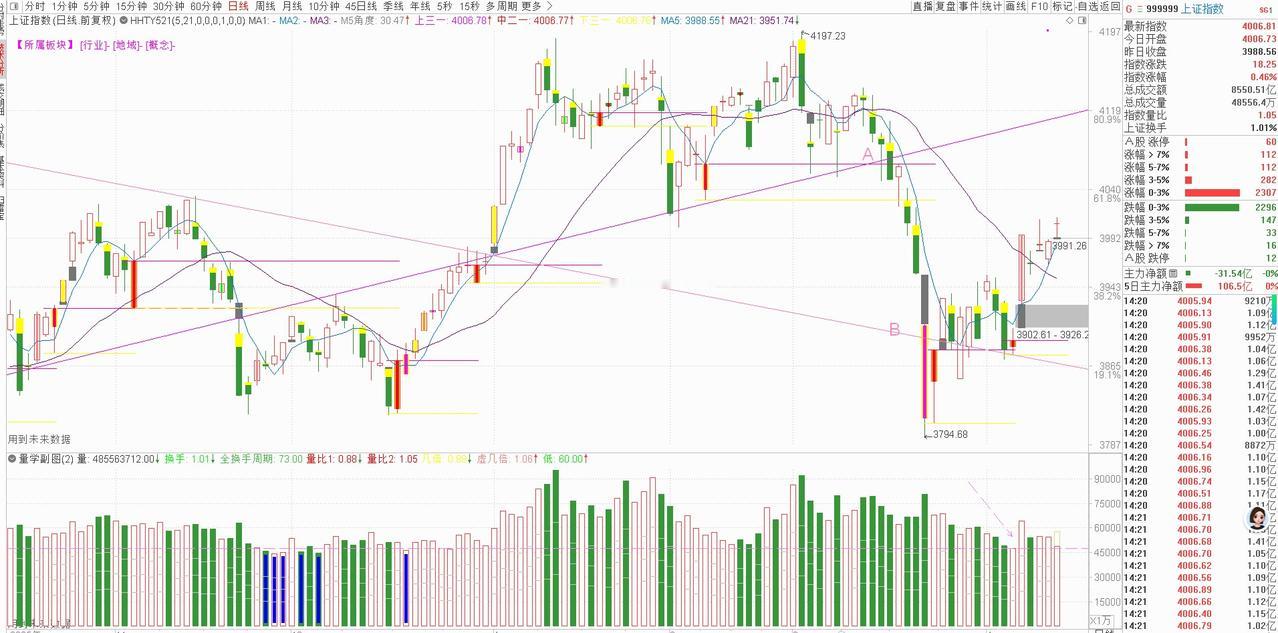 4月15日大盘展望:强势延续,聚焦四大主线 今天大盘呈现典型的强势异动行情,跳空高开于4006点,与昨日预判的上线4011点仅差5点,随后震荡上攻,最高触及4026点,全天未回补跳空缺口。从量学角度看,这种**跳空高开、强势不回补**的走势,是主力资金主动上攻的明确信号,属于重要的异动行为。 今日大盘最低回踩至3992点,差1个点精准契合0413的虚顶3991点,显示市场支撑位极为有效。全天价量配合良好,大阳线实体确认多头主导格局。量学体系中,大阳线、倍量柱、梯量柱等均属主力异动,这类信号是个股与大盘上涨的核心基因,预示短期趋势有望延续。 基于量学"盘前三线"理论,结合今日量价结构,4月15日(星期三)关键点位已明确:**上线4042点**(强压力位)、**中线4026点**(多空分水岭)、**下线4006点**(核心支撑)。操作上,指数站稳中线则偏多,回踩下线不破可低吸,突破上线则打开新空间。 板块方面,四大方向值得重点关注: - **算力租赁**:受益AI需求爆发与租赁价格上涨,政策与业绩双轮驱动 - **商业航天**:产业政策利好密集,商业发射常态化带来增长机遇 - **绿色电力**:能源转型加速,风光储产业链盈利持续改善 - **CPO(共封装光学)**:英伟达量产催化,技术突破带动光模块升级 综合判断,4月15日大盘将延续强势震荡格局,重点关注4007点支撑有效性。操作上建议以**线上持股、线下观望**为原则,聚焦算力、航天、绿电、CPO四大高景气赛道,把握主线轮动机会。