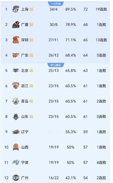辽宁赢了山东,广东输给宁波。
