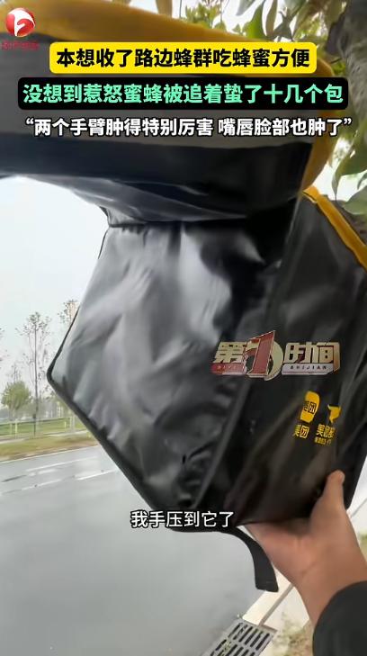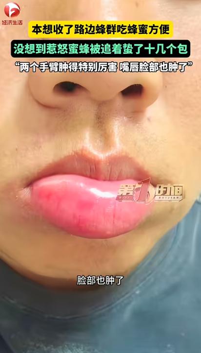 “胆子真大!”近日,河南息县,一男子上班时,在路边一棵树上发现了一群蜜蜂,他看网上收蜂简单,就想自己试试,但因为经验不足,惹怒了蜂群,男子被追着蛰了十几个包,最后两个手臂肿得特别厉害,嘴唇和脸也肿了!网友:这可是个技术活! 事发那天,男子正沿着道路慢慢前行,走到一处路段时,一阵密集的“嗡嗡”声传入耳中。 他下意识抬头张望,才发现路边树的一根枝条上,聚集着一大团黑乎乎的蜂群,密密麻麻地簇拥在一起,看着十分显眼。 男子停下脚步,凑到树周围仔细打量,确认是一群蜜蜂后,脑子里瞬间浮现出之前刷到的各类收蜂短视频。 相信不少人都刷到过类似内容——视频里的博主们收蜂时得心应手,要么拿个笼子轻轻一引,要么用小刷子温柔驱赶,蜜蜂就乖乖钻进容器里,全程轻松又顺畅。 男子越想越心动,他琢磨着,若是能把它们收回家,那么自己想什么时候吃就什么时候吃,而且纯天然、无添加,既省钱又放心,怎么想都是一笔划算的买卖。 下定决心后,他随手拿起了车上的箱子,然后就跑到那棵行道树下,一心只想赶紧把这群蜜蜂“带回家”。 当时树下没什么过往行人,男子的胆子也大了起来,他双手捧着箱子,屏住呼吸,慢慢靠近树枝上的蜂群,眼神紧紧盯着那一团蜜蜂,生怕惊动了它们。 他凭着记忆模仿网上博主的动作,想把箱子轻轻扣在蜂群上方,让蜜蜂自己慢慢爬进盒子里。 或许是过于紧张,或许是距离把控不当,他的手指不小心碰到了几只停在枝条上的蜜蜂,指尖瞬间传来一阵尖锐的刺痛。 那种疼痛感带着明显的灼烧感,顺着指尖快速蔓延到手臂——这是他第一次被蜜蜂蛰,而这突如其来的疼痛让他彻底乱了阵脚。 慌乱之中,他下意识地猛地抬手,并将手中的箱子狠狠扣在了树枝上,然后又急急忙忙把箱子口盖紧,只想把蜜蜂牢牢困在里面。 原本只是轻微警惕的蜜蜂,被这突如其来的动静惹得躁动起来,周围的蜜蜂开始围着男子嗡嗡作响。 男子意识到事情不对劲,哪里还敢有半分停留,猛地转过身,拼尽全力朝着远处狂奔而去,只想尽快逃离这群愤怒的蜜蜂。 可这群被激怒的蜜蜂,根本没有打算轻易放过他,一大群蜜蜂黑压压地跟在他身后,时不时就有几只蜜蜂扑上来,在他身上又蛰一下。 好在最终,男子成功的从蜜蜂的追赶中逃脱了。 等他缓过一口气,才发现全身上下布满了密密麻麻的小红包,而且都在隐隐作痛,仔细数一数,足足有十几个,每一个都又红又肿、又疼又痒,看着十分吓人。 尤其是两个手臂,已经开始快速肿胀,还带着灼热感,连抬手的动作都变得十分费力。 男子感觉自己除了红肿和疼痛,没有头晕、心慌、呼吸困难等其他不适,就没去医院。 不过,慌乱之中,还是有一部分蜜蜂被他困在了箱子里,后来简单收拾了一处地方,把蜜蜂放了进去,也算成功收了一部分蜜蜂。 就算手臂和脸还在肿胀,他还是每天都会特意去看看这群刚被自己收回来的蜜蜂,嘴里常常念叨着,等蜂蜜酿好了,一定要先尝一口,也算没白被蛰。 这件事情被发到网上后,很快就火了起来,评论区瞬间被网友们的留言填满。 有网友留言说:“十几个包,还是脸和手臂这些敏感部位,估计没个三四天,肿胀根本消不下去,想想都觉得疼。” 还一些有收蜂经验的网友表示:“收蜂前要先观察蜂群的状态,判断是否温顺,操作时动作一定要轻柔,绝对不能粗暴,而且必须做好防护措施,防蜂帽、手套缺一不可,否则很容易被蜂群攻击。” 还有网友说:“男子这不是收蜂,是主动送上门给蜜蜂蛰——这种毫无经验、还粗暴操作的行为,被蛰一点都不意外。” (信息来源:AHTV第一时间《理想很丰满,现实却很扎人。男子本想收了路边蜂群,回家养着吃蜂蜜方便,没想到惹怒蜜蜂被追着蛰了十几个包。“两个手臂肿得特别厉害 嘴唇脸部也肿了”》)