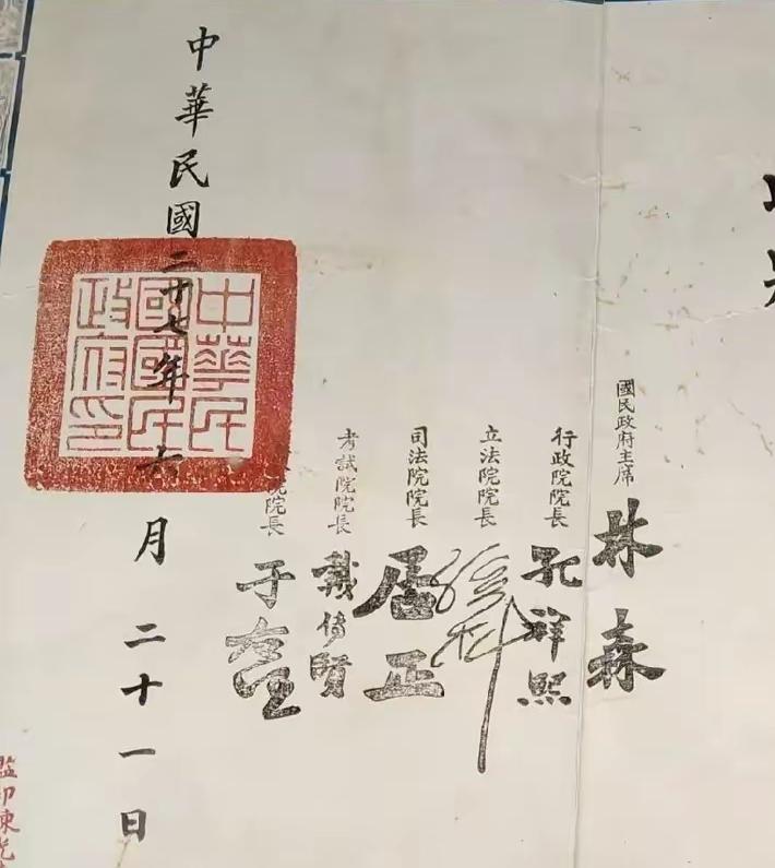 这是一张由当时国民政府签发的证书,内容是毛泽东被依法选定为国民参政会参议员,签发日期为民国二十七年,即一九三八年。当时国共两党己达成共识:停止内战,共同抗日。国民党颁发给共产党最高领袖毛泽东国民参政会参议员证书,是向外界表明,国共两党己摒弃前嫌,枪口一致对外,共同抗战。 其实,颁给毛泽东国民参政会参议员的证书,只有象征性意义,并无实权。中央方面还有六人也是国民参政会参议员,他们分别是:陈绍禹(王明)、秦帮宪(博古)、林祖涵(林伯渠)、吴玉章、董必武、邓颖超。 证书上不仅盖有中华民国国民政府的大红方章,而且还有当时的国民政府主席林森、行政院院长孔祥熙、立法院院长孙科、司法院院长居正、考试院院长戴传贤、监察院院长于佑任的签名,以此彰显此证书的份量。