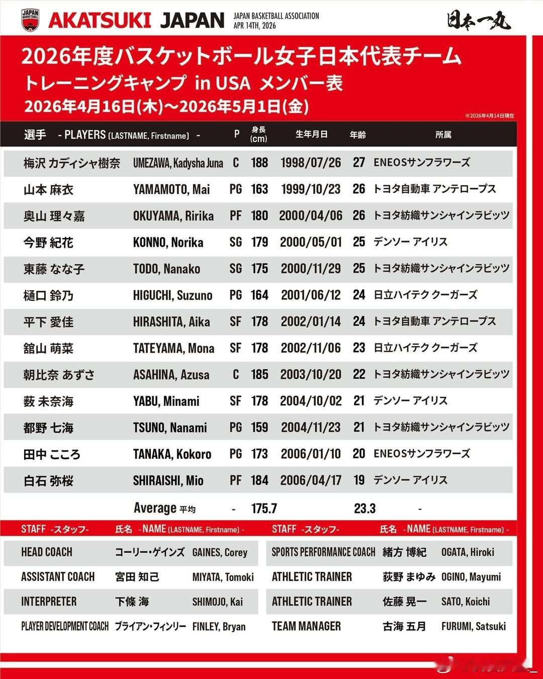 【日本女篮即将开启集训 与WNBA球队交手】日本篮球协会今日公布了日本女篮的集训计划,球队将于4月16日至5月1日在美国亚利桑那州和内华达州展开训练营。期间,日本女篮将与WNBA球队拉斯维加斯王牌、菲尼克斯水星分别进行交流赛。据悉,今日被金州女武神选中的田中心将随女武神训练,而不会参加本次日本女篮国家队集训。