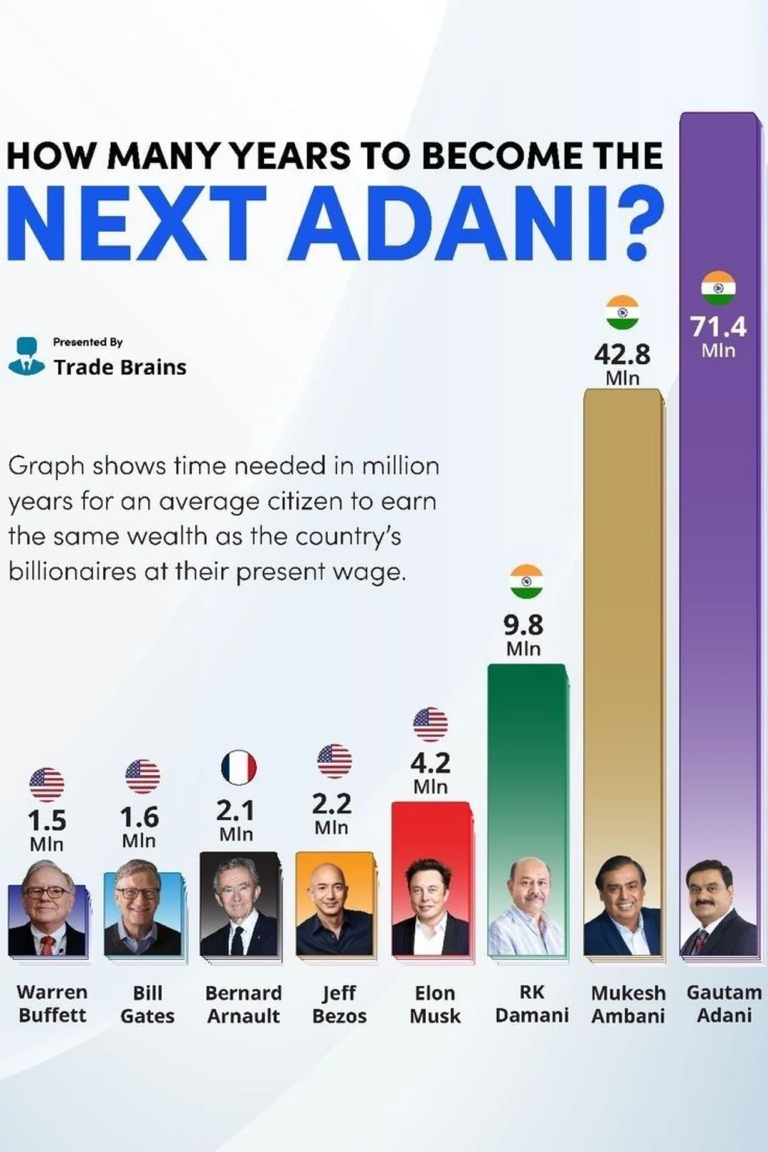 当目标换成印度富豪,这个数字直接被拉爆。成为Radhakishan Damani需要约980万年;达到Mukesh Ambani约4280万年;而成为Gautam Adani,竟然需要7140万年。