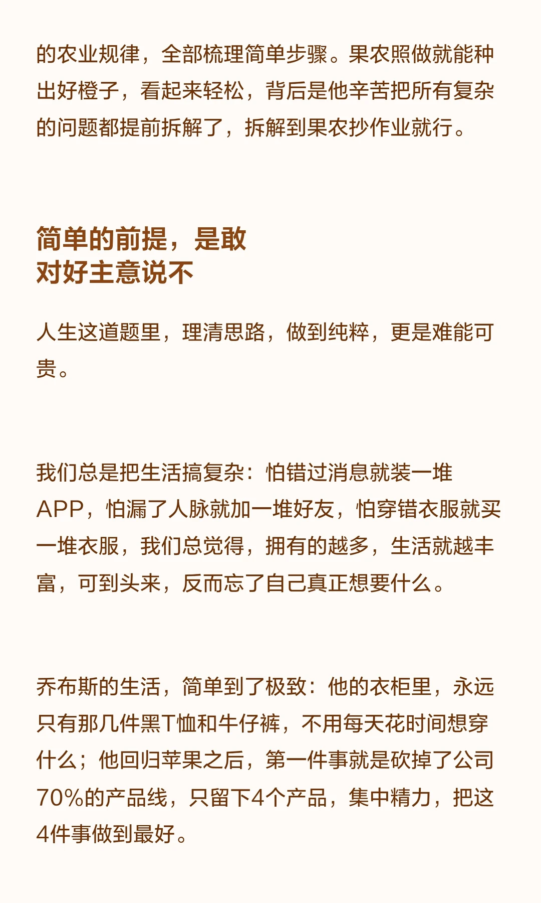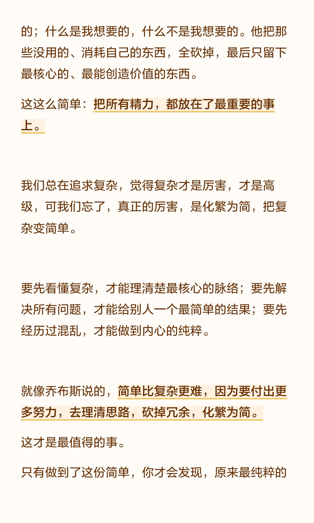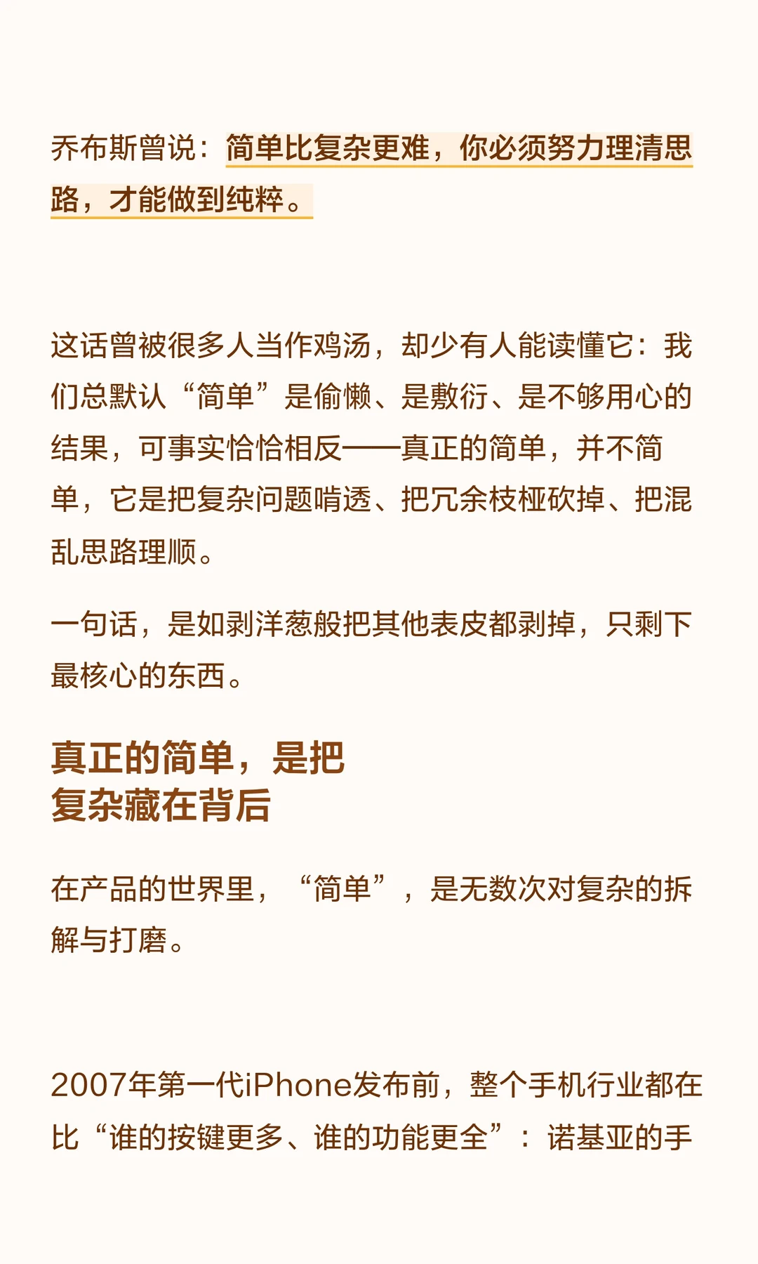 复杂往往让人精疲力尽,真正的简单是理清思路,砍掉冗余,把复杂问题简化。 无论是产品设计还是生活决策,专注并理清核心目标,才能做到纯粹。 简单不简单,考验的是对复杂问题的洞察与处理能力。