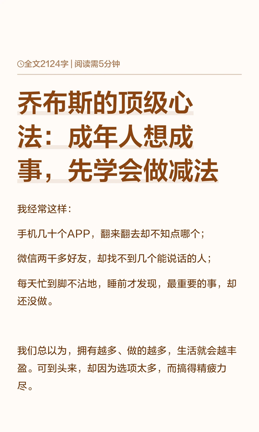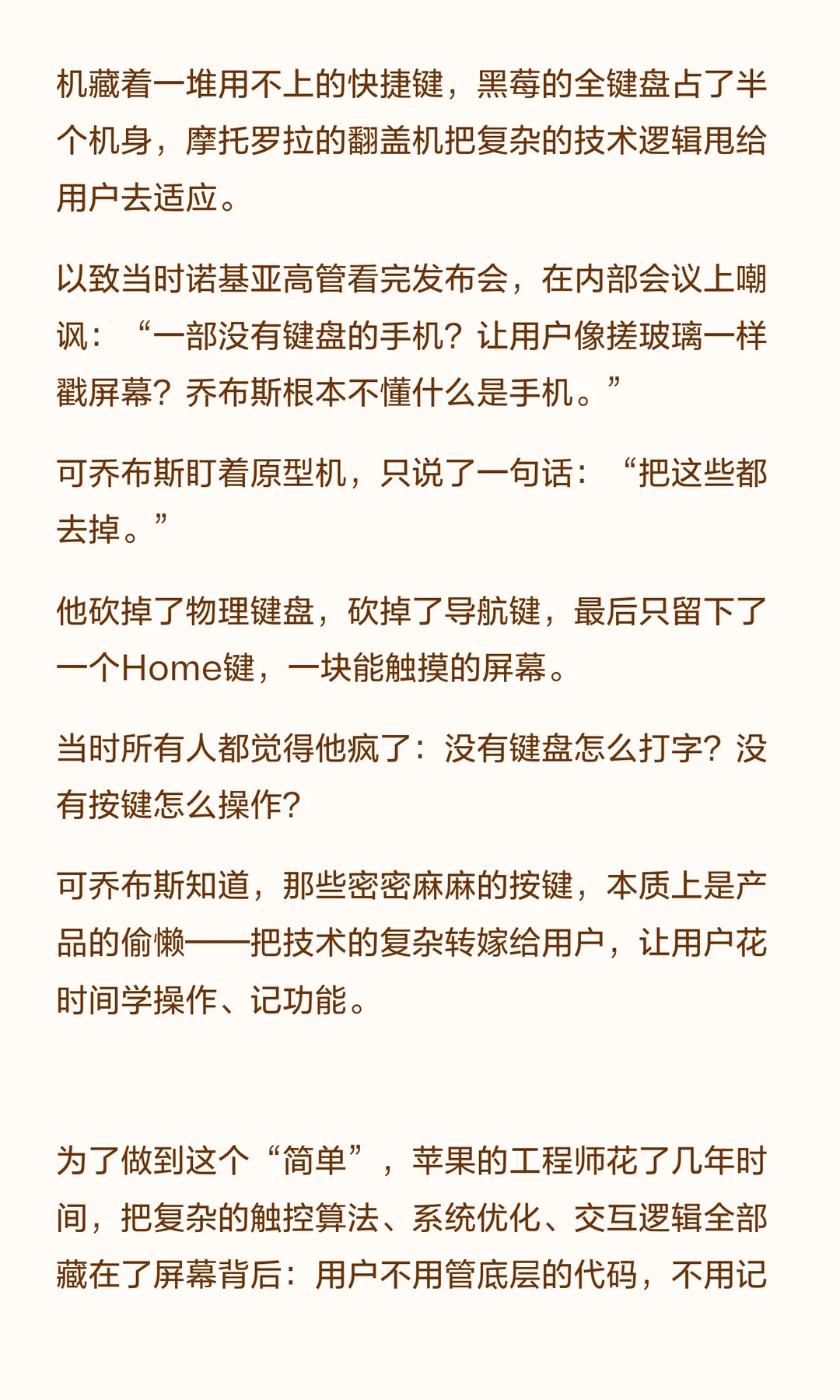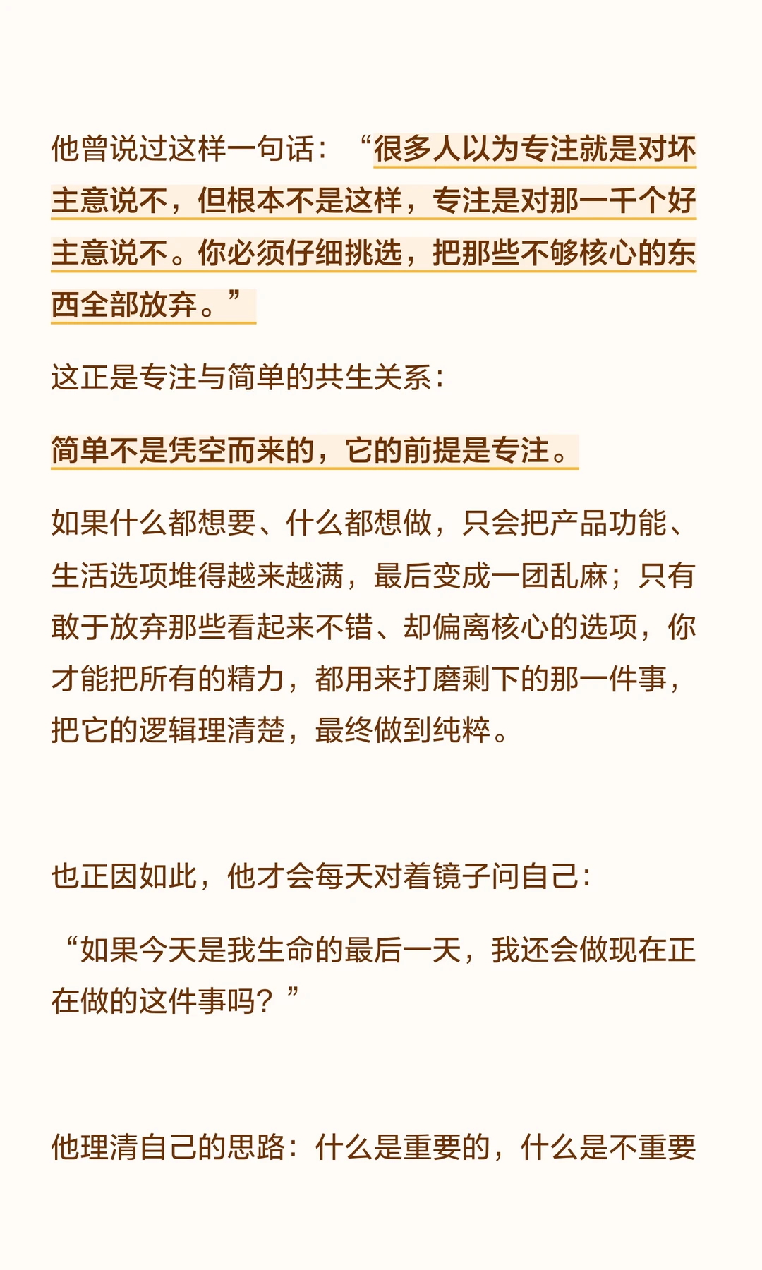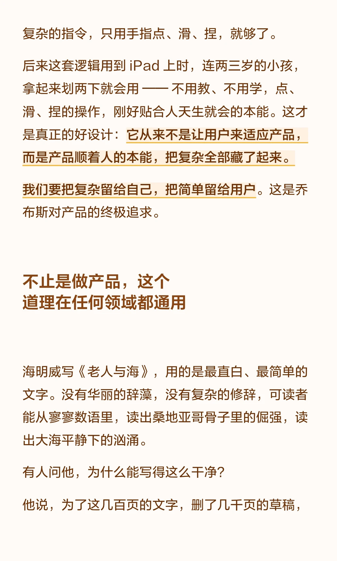 复杂往往让人精疲力尽,真正的简单是理清思路,砍掉冗余,把复杂问题简化。 无论是产品设计还是生活决策,专注并理清核心目标,才能做到纯粹。 简单不简单,考验的是对复杂问题的洞察与处理能力。