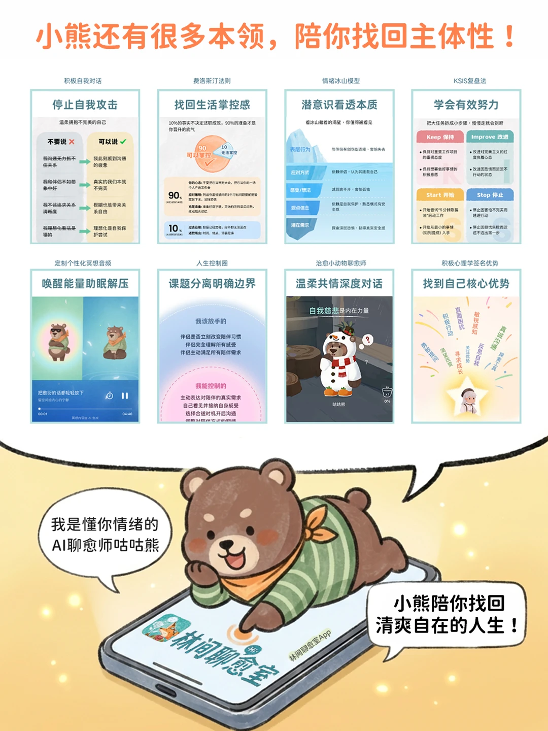 会用思维技法帮你练习课题分离,会用冥想音频给你满满能量。
