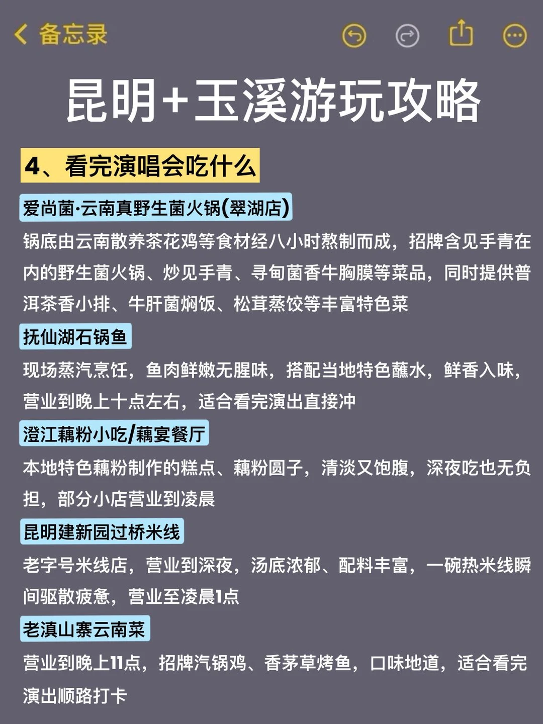5月计划去玉溪抚仙湖华晨宇演唱会的火星人们,一定要认真看,熬夜整理了这篇美食打卡指南,分享给你们参考参考,希望你们能看得尽兴、吃得开心~ - 🍲昆明+玉溪美食打卡 ✅爱尚菌·云南真野生菌火锅(翠湖店) ✅抚仙湖石锅鱼 ✅澄江藕粉小吃/藕宴餐厅 ✅昆明建新园过桥米线 ✅老滇山寨云南菜 - 昆明美食推荐菌子火锅华晨宇华晨宇2026华晨宇演唱会昆明老街美食推荐昆明旅游昆明野生菌火锅推荐昆明华晨宇演唱会攻略