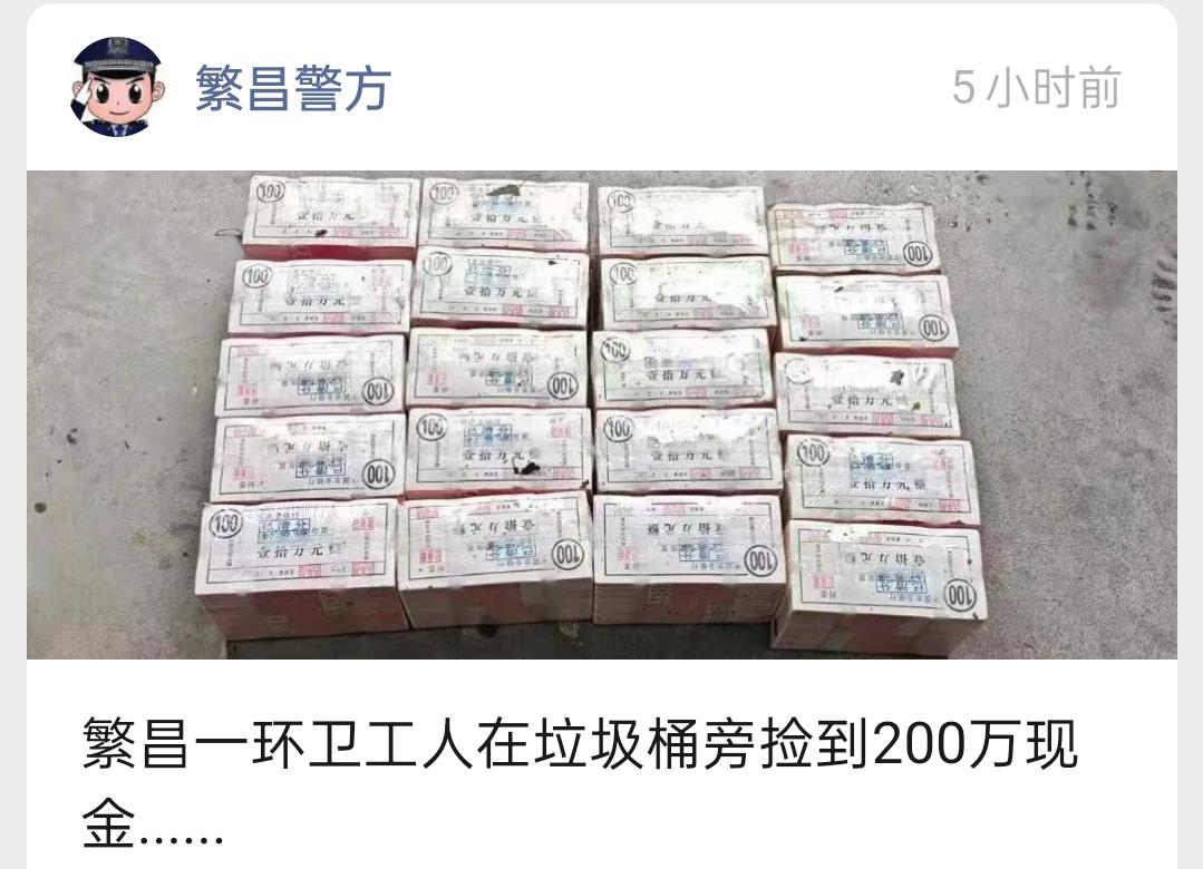 安徽芜湖:环卫工人称捡到200万元现钞,警察到场后发现是一场虚惊。 4月9日 ,安徽芜湖繁昌分局城关派出所接到环卫公司从先生报警,称其公司王大爷在某建材城垃圾桶旁捡到一个袋子, 里面装的全是纸币。 原来,王大爷在进行环卫作业时,发现了这个袋子。起初,认为袋子里面装的是垃圾,但是感觉分量比较沉,不像是一般的垃圾。 于是王大爷准备打开袋子一看究竟,这一看不要紧,吓得王大爷一身冷汗 ,原来袋子里面装的的确不是垃圾,而是一捆一捆的人民币。 工作中发现这么多钱,这还了得 ,估计至少有好几百万。王大爷不敢怠慢,急忙向公司领导汇报。而公司领导也没见过这样的事,不知道咋处理,于是就报警了。 接到环卫公司报警后,警方也不敢耽搁,毕竟这么多钱不是小数目,事发原因还需要进一步查清楚。于是,组织警力赶到现场。 民警到达现场发现 ,一捆捆有着银行封签、票面图案的纸币装在一个塑料袋里,每捆封面贴纸上印有壹拾万元字样,总共20捆,据此推算总共应该是200万元。 不过 ,民警仔细辨认才知道,这些纸币原来不是真钱,而是金融机构专用的练功币,环卫工人们虚惊了一场。 警方表示 ,虽然这些钱不是真钱 ,但王大爷和环卫公司拾金不昧的精神却货真价实,值得表扬。