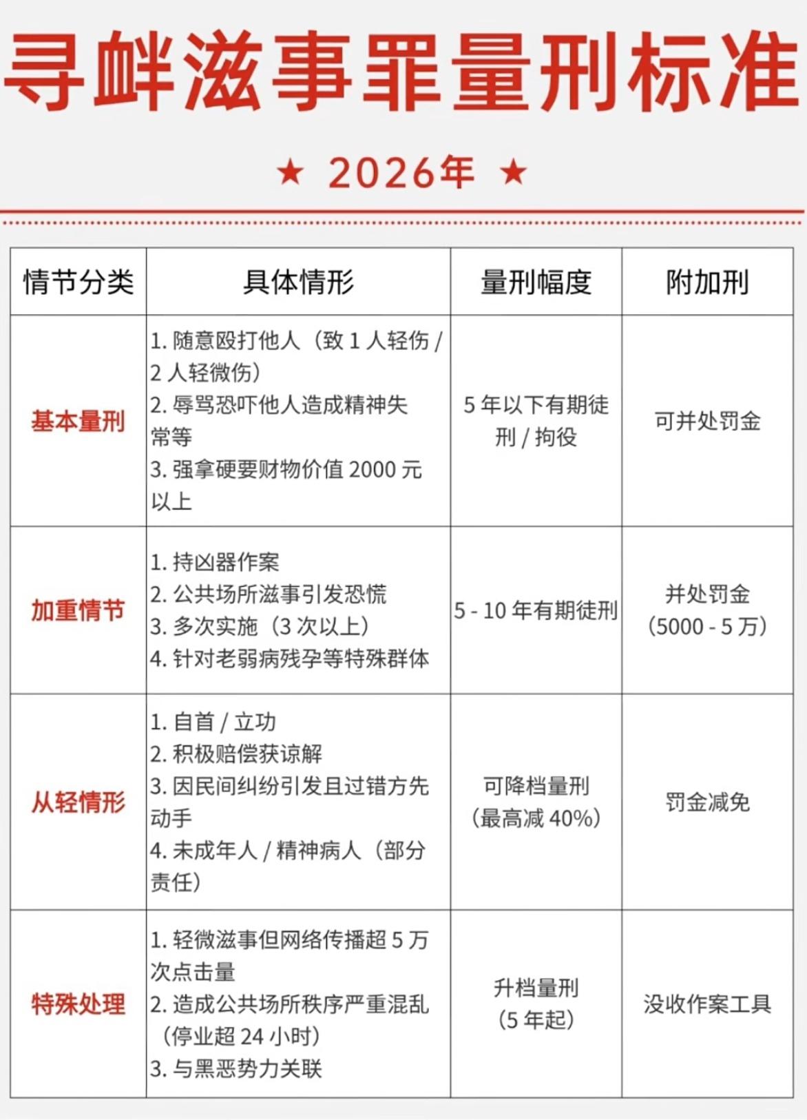 2026年寻衅滋事罪量刑标准,打架耍横可不是小事,一不小心就触犯刑法! 如果随意打人致1人轻伤、2人轻微伤,或者强拿硬要2000元以上,就够立案,最高判5年!如果要是持凶器作案、在公共场所闹事、欺负老弱病残孕,或者作案3次以上,直接加重处罚,5到10年牢饭,还要罚5000到5万! 当然如果自首、积极赔偿拿到伤者谅解,最多能减40%刑期,罚金也能减免。但要是网络传播超5万次、把商家闹到停业24小时以上,或者和黑恶势力勾连,直接从5年起判,作案工具还会被没收! 千万别拿法律当儿戏,遇事别冲动,不然真要付出代价!殴打伤人