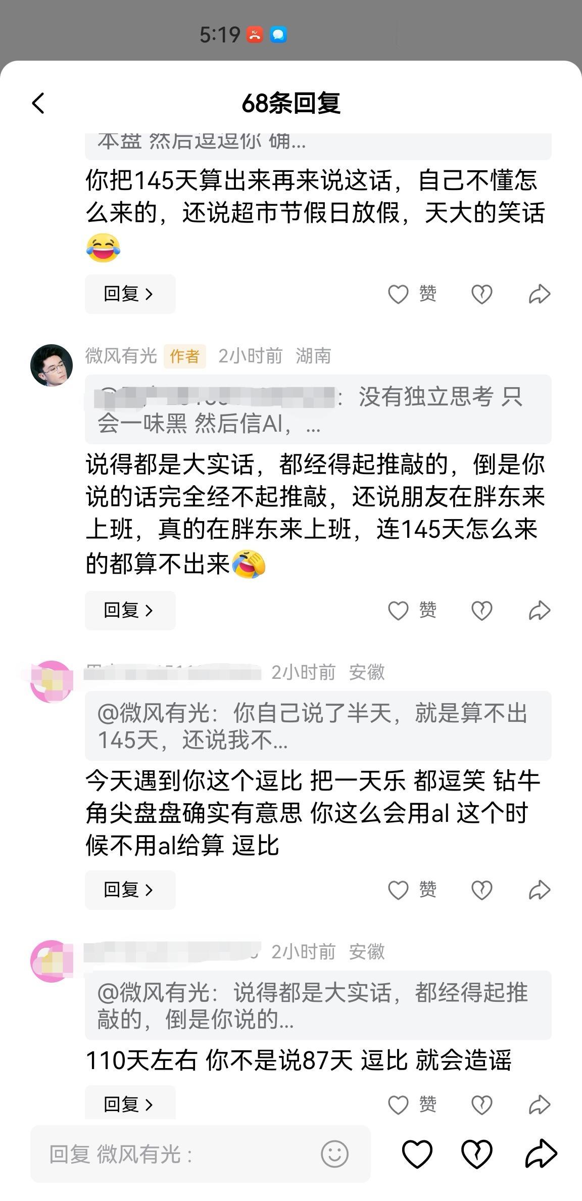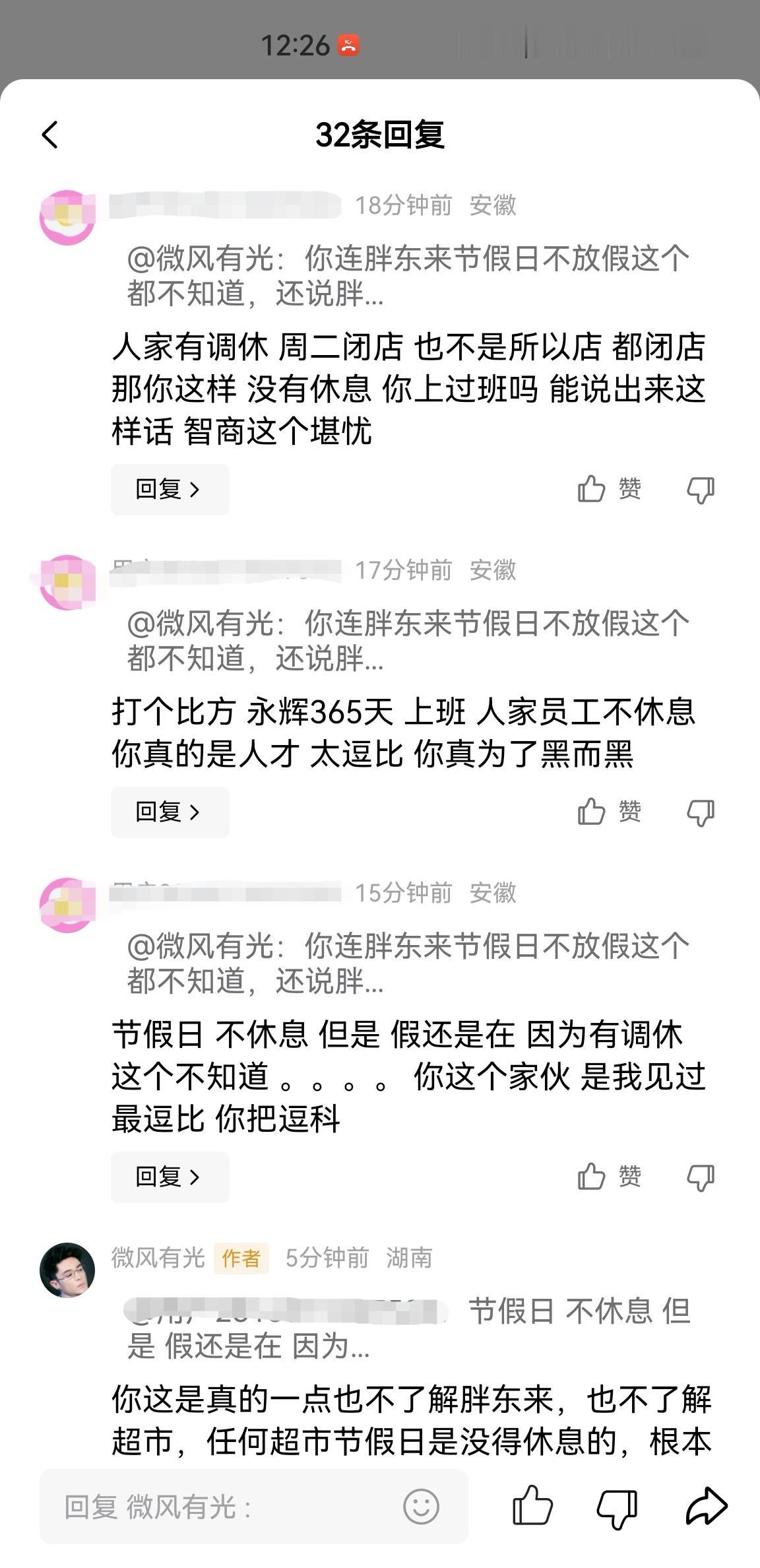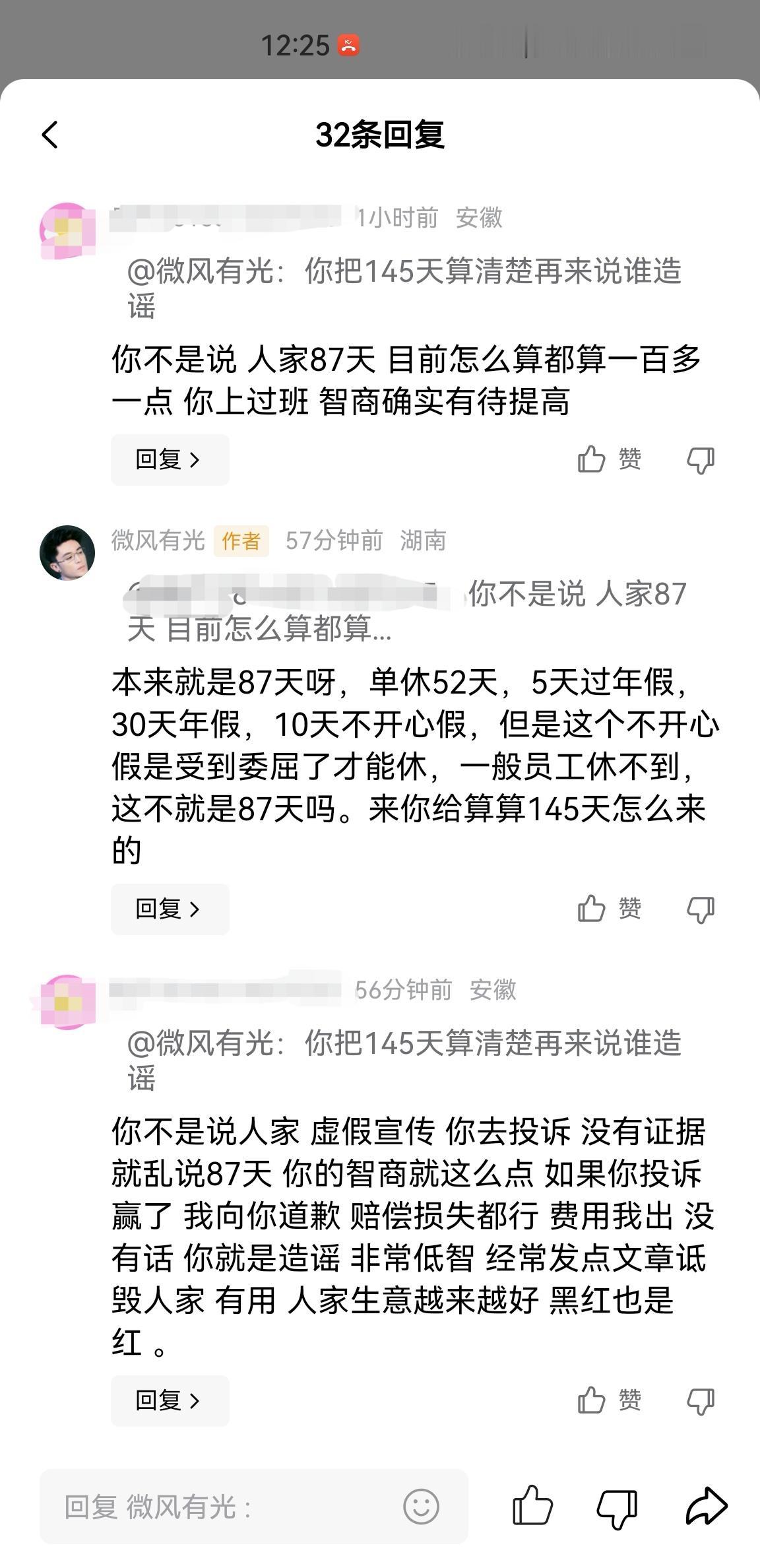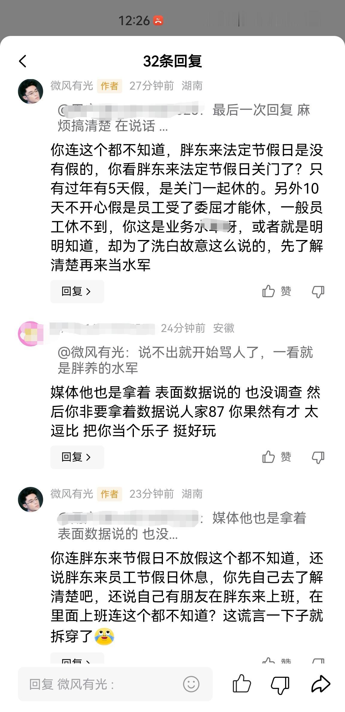 关于胖东来一年150天假期,有个胖东来粉丝闹了个笑话,他说有几个朋友在里面上班,但是可笑的是他竟然不知道超市节假日是没有假期的。 胖东来对外宣传员工每年假期有150天,相信很多人并不知道这个是怎么来的,就连这位号称有几个朋友在胖东来上班的网友也算不出来。 其实我已经发了好几篇作品科普过胖东来真实假期只有87天,这个150天是用每天少上的1小时当做假期,四舍五入一周就有1天,一年就有52天,加上52天单休,5天过年假,30天年假,10天不开心假,这就变成了150天。 而这位胖东来粉丝号称有好几个朋友在胖东来工作,却无论如何都算不出这个150天究竟是怎么来的。 他说我87天少算了不开心假,少算了法定节假日,不开心假这个是有条件的,一般员工休不到,哪怕算上也不过97天。 而这个法定节假日呢就更离谱了,五一、国庆这些小长假正好是人多的时候,大超市是不可能给你放假的,而调休也更加不可能,一调休整个排班就会全部打乱,要休肯定是一起休,不会把法定节假日作调休的。 跟他沟通了半天,他就是不肯承认,他也无论如何都算不出这个150天怎么来的,最终他加上不开心假、法定节假日,得出胖东来员工假期110天左右,可还是跟这个150天有很大出路。