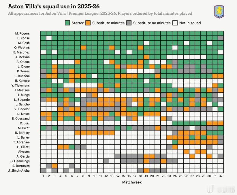 阿斯顿维拉 TA 做了一个统计图表,清晰标示了维拉每个球员本赛季英超的出场情况,劳模无疑是罗杰斯,32轮联赛场场首发,只有5场临近结束被换下,剩余全部打满90分钟。杯赛也踢了大部分比赛,各项赛事46场,3770分钟。这也说明维拉的阵容确实单薄,没有人顶上罗杰斯的位置,适当进行轮换。埃梅里赛后也回应了罗杰斯的转会传闻,说罗杰斯专注于维拉。埃梅里也表扬罗杰斯是多面手,左边锋,前腰、二前锋,右边锋都能打。罗杰斯虽然年轻,23岁,但这么用,会被用废了啊!诺丁汉森林1比1阿斯顿维拉
