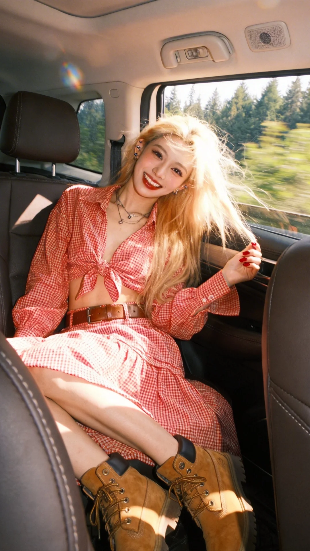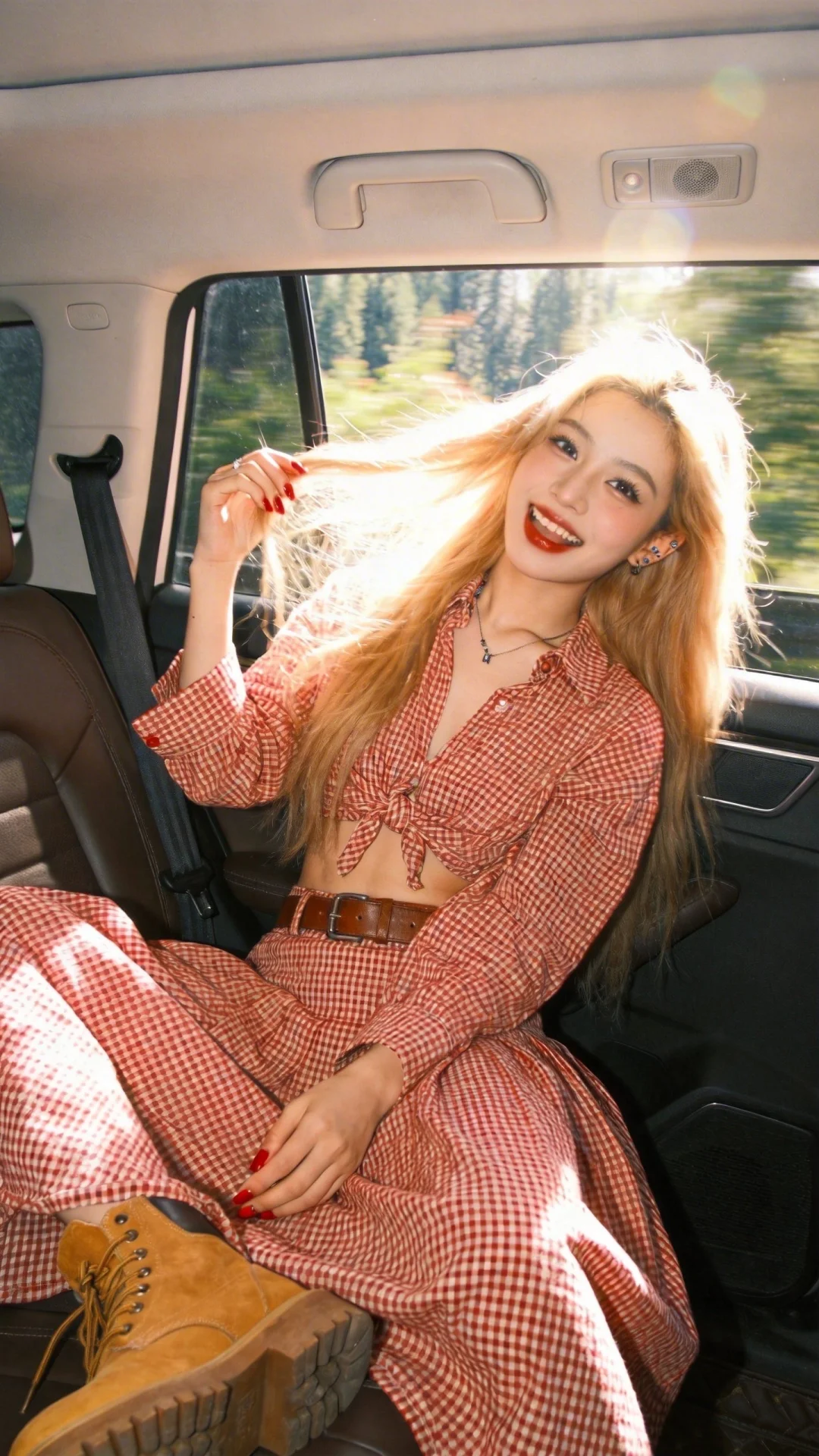 一位长发及腰可爱的女生。构图随意却尽显生活中的绚丽日常,人像摄影,竖屏9:16,日常快照风格,非精心构图或打光,以日系少女写真的风格呈现,略微俯视角度,质感光照搭配自然光线,构图随意却尽显生活中的绚丽日常,姿态自然随性,人物为18岁左右甜酷辣妹少女,冷白皮、超级瘦,模特身材,五官精致灵动,皮肤细腻通透,奶金色超长直发,发丝蓬松柔顺,被丁达尔阳光打出发光通透感,发丝被风吹动、动态飘逸;妆容为美式甜酷辣妹妆,清透持妆底妆,氛围感眼妆,水润红唇,松弛感拉满;美甲为超长红色御姐风美甲,细节感拉满;配饰为简约项链、多耳洞耳钉,甜酷感拉满;穿搭造型为上衣:红白格纹长袖衬衫(宽松慵懒版型,胸前打结设计,露腰露腹,辣妹风);下装:同色系红白格纹半身长裙(高腰设计,一根棕色皮带收腰,大裙摆,垂坠感强);鞋履:棕色厚底大黄靴/马丁靴,复古工装感,舒适百搭;场景环境为行驶中的SUV/轿车后排,车内真皮座椅、车顶扶手、车窗、音响等细节;窗外远景为动态模糊的森林绿植、阳光树影、自然风景,行驶中的动态感;环境细节为丁达尔效应阳光、车窗光晕、车内暖光、发丝发光、生活氛围感;行驶中的车辆,动态模糊,车窗风感,发丝飘动,原生感抓拍;旅行氛围图,生活化随手抓拍,男友视角/车内第一人称视角;画面风格为高清相机质感,写实人像,无AI痕迹,保留真实皮肤纹理与发丝细节;韩系松弛感甜酷风,电影感侧逆光,暖调阳光光影,胶片颗粒感,动态模糊;3:4构图,半身/全身人像,人物为视觉中心,突出旅行治愈氛围感;明亮丁达尔阳光+车内光影,阳光透过车窗,通透光感,暖调氛围,原生感车内抓拍质感,柯达Portra400胶片模拟,复古颗粒感,暖调怀旧色调,发丝发光,氛围感拉满;动作表情为坐在窗边,歪头甩动长发,单手撩开挡脸的碎发,眼睛亮晶晶看镜头,元气大笑,动态模糊,车窗风感拉满