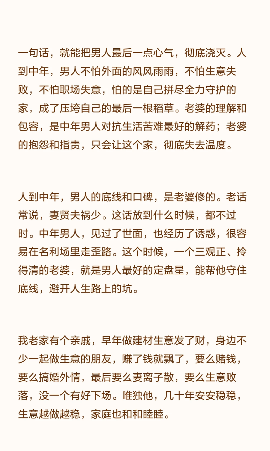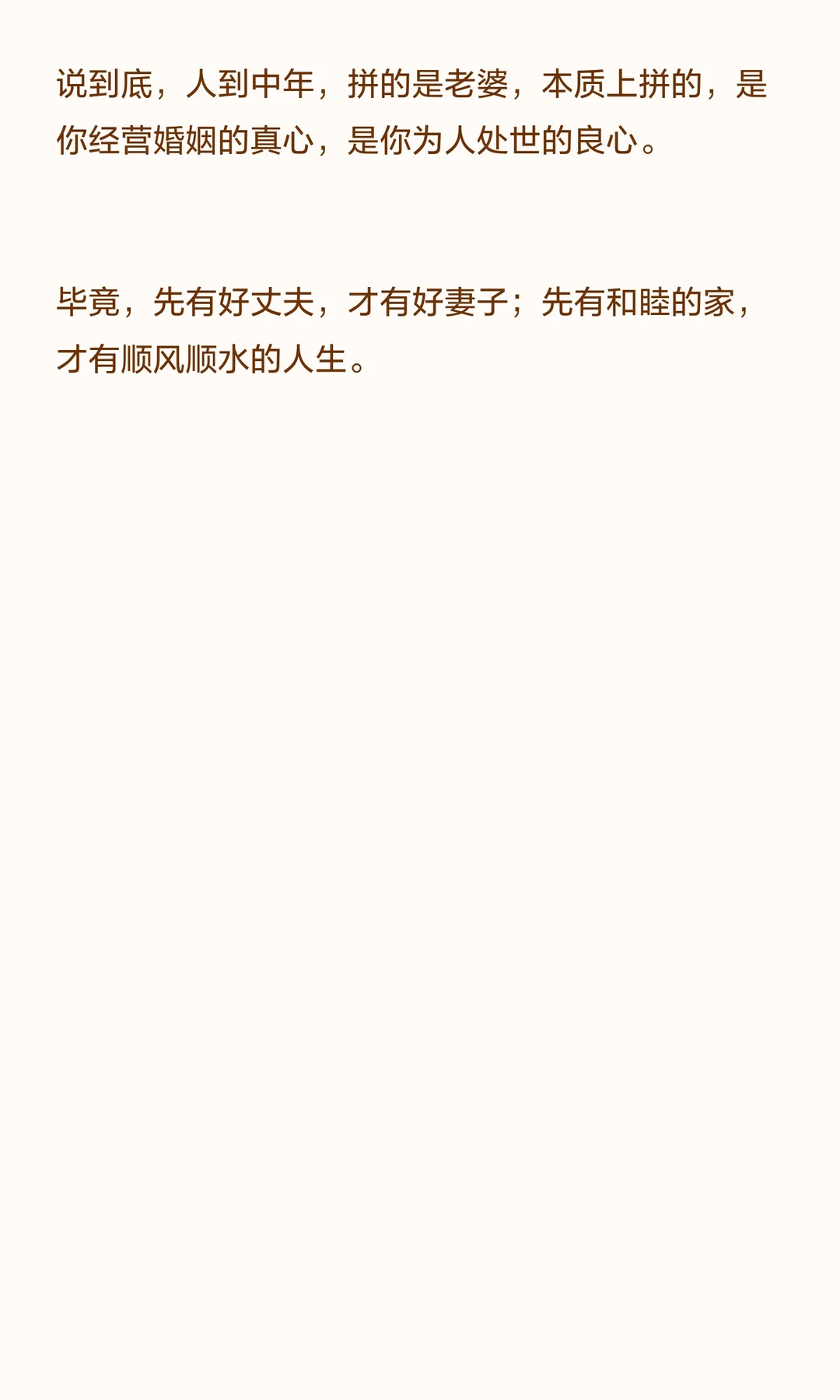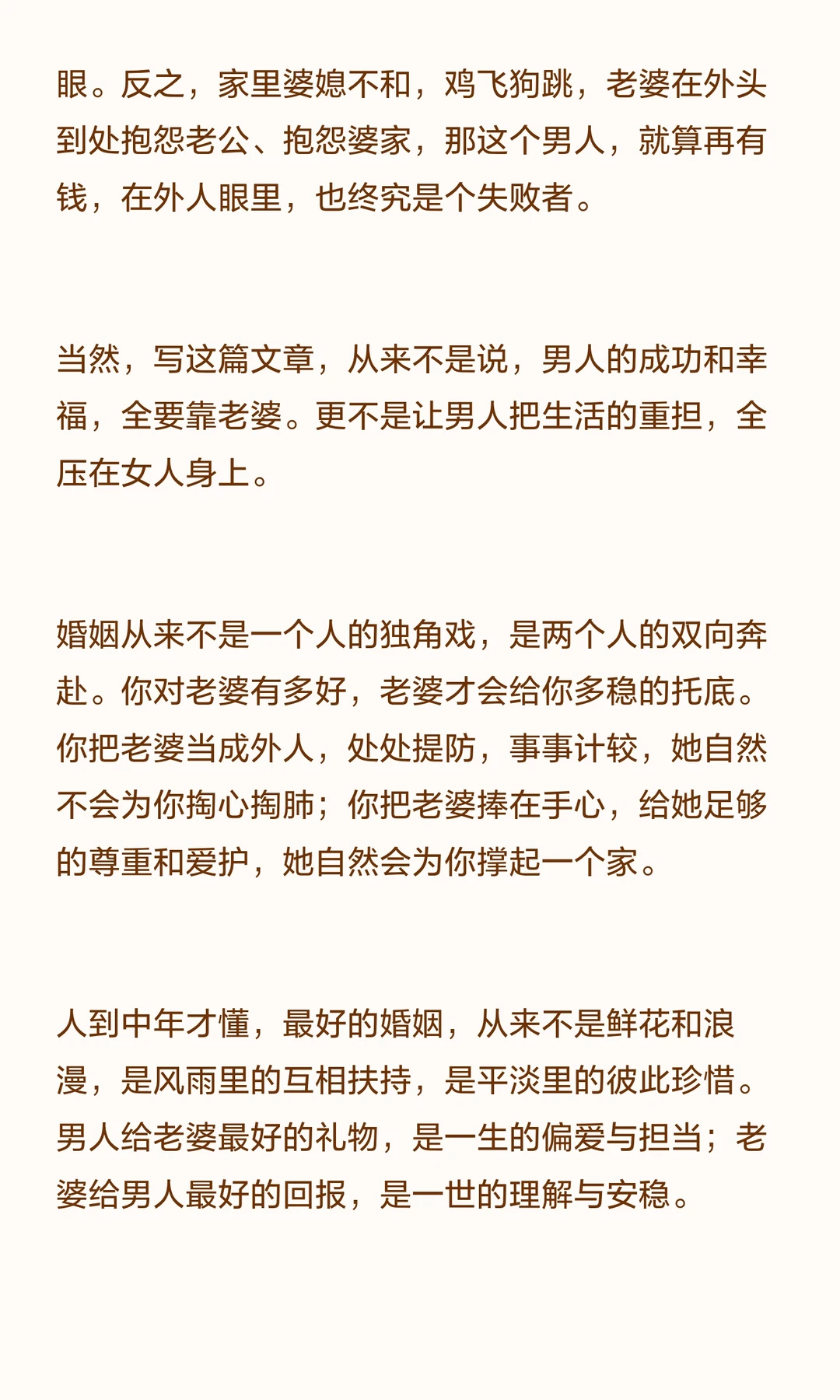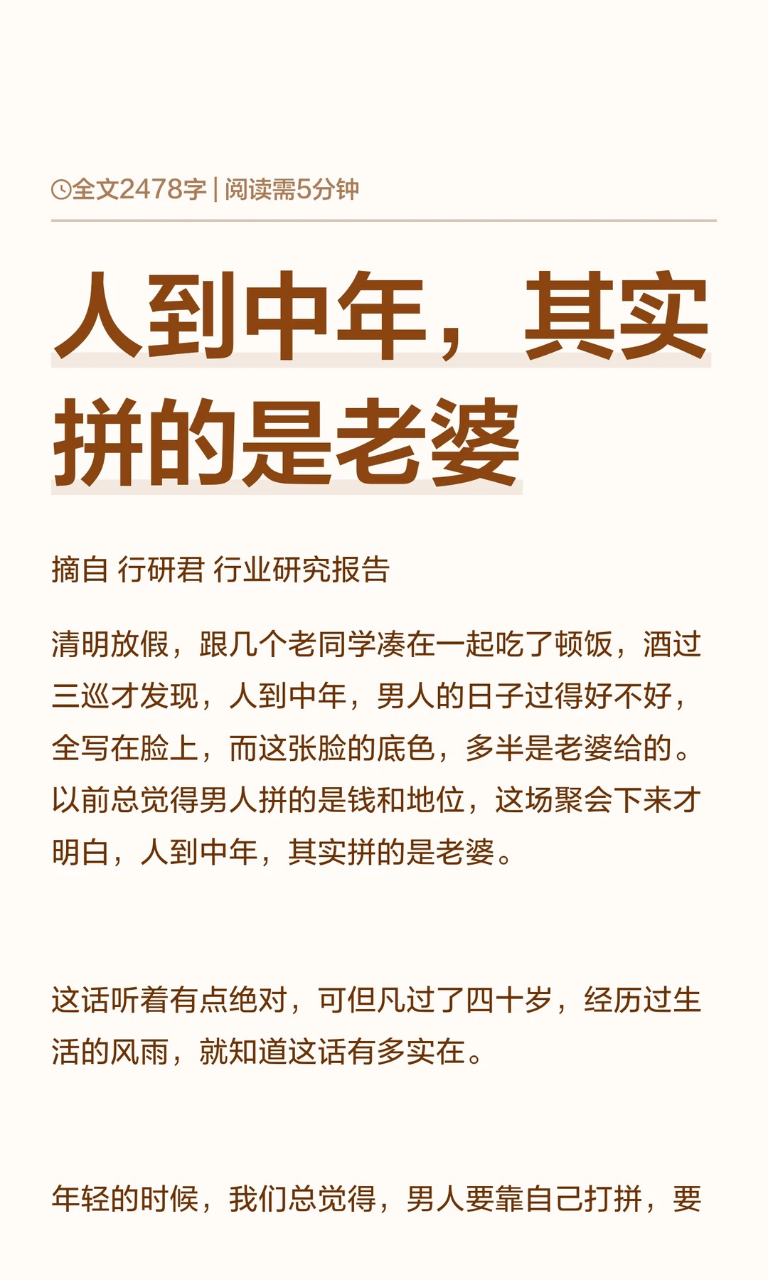 人到中年,男人的底气和幸福,全靠老婆的支撑。 家庭的稳定、老人的照顾、孩子的成长,都是老婆默默付出的结果。 老婆的理解、包容和支持,是男人对抗生活压力的最好解药。 婚姻的真谛,在于互相扶持与珍惜,经营好婚姻,才能在人生路上走得更稳更远。 行研君这篇文章写得不错。有兴趣的可以读读。:)