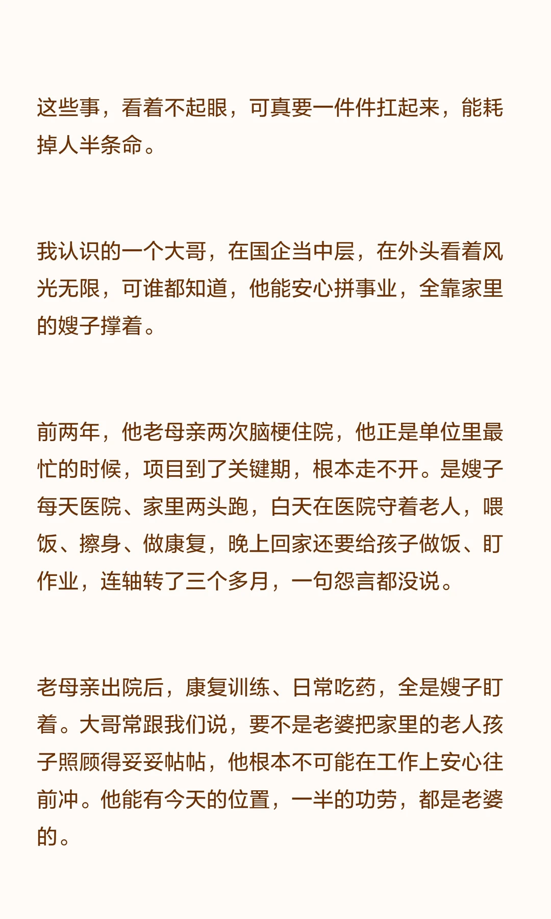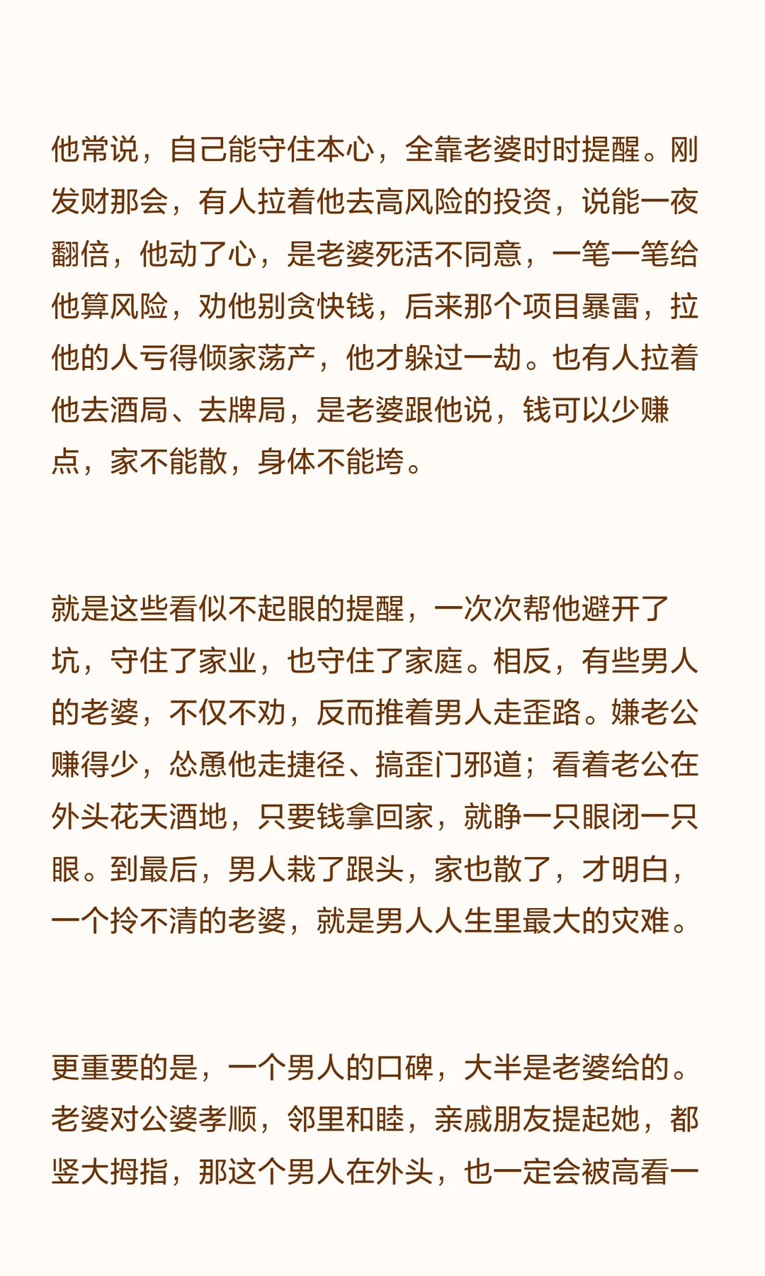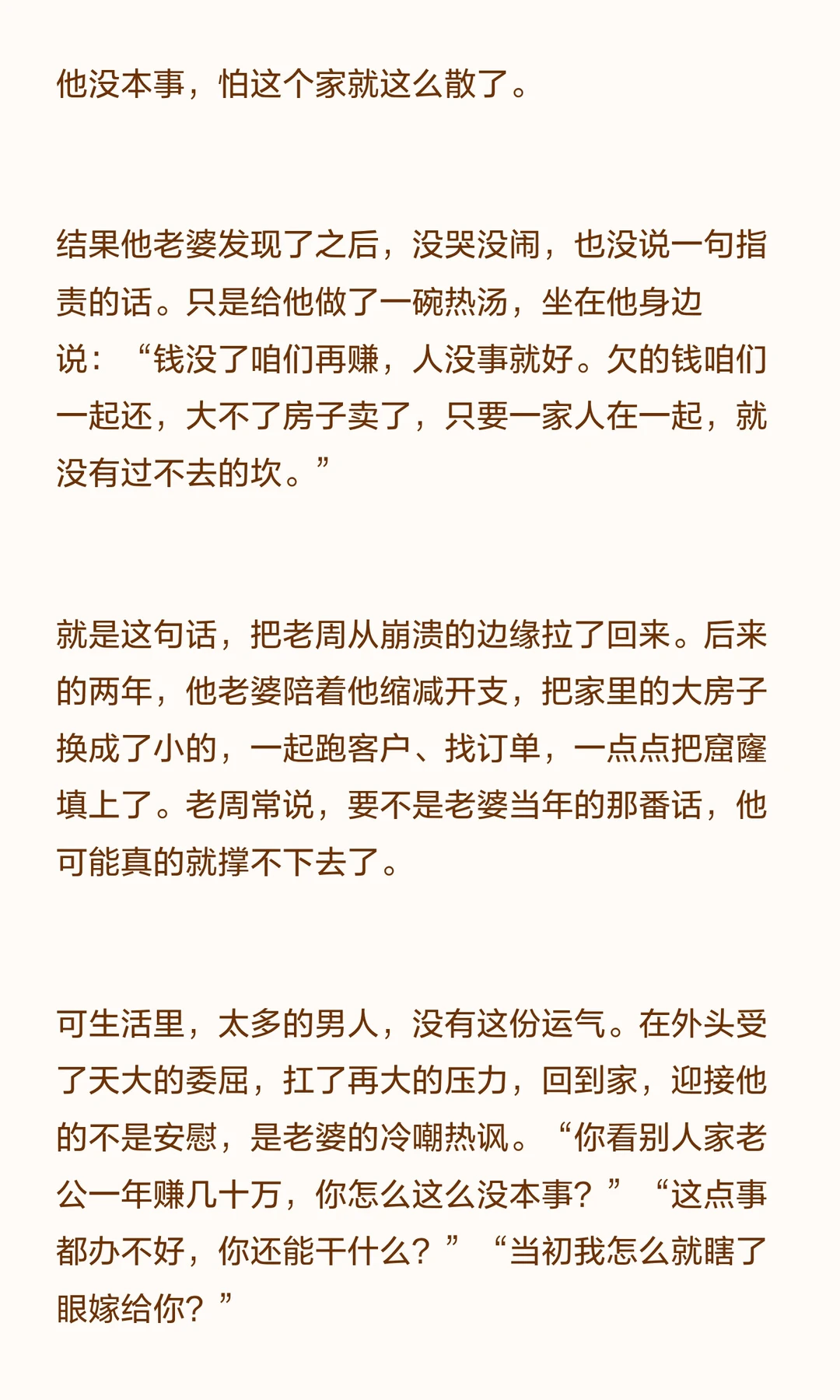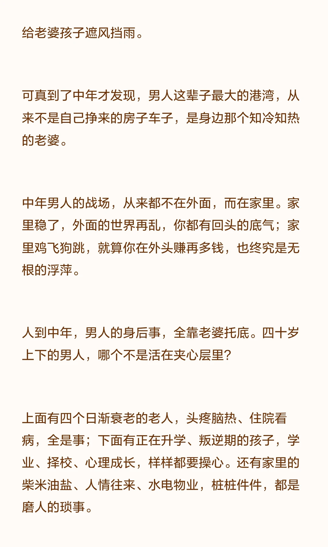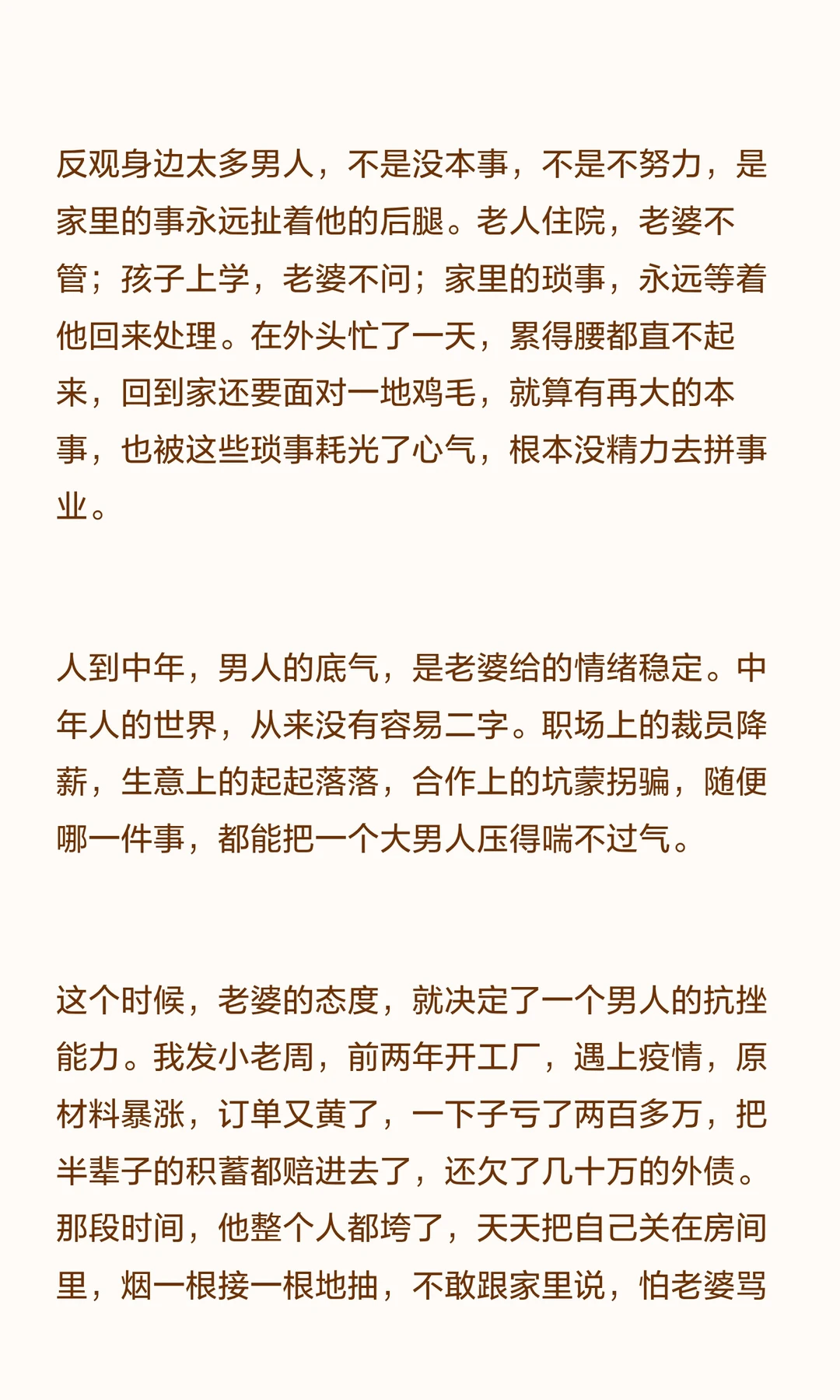 人到中年,男人的底气和幸福,全靠老婆的支撑。 家庭的稳定、老人的照顾、孩子的成长,都是老婆默默付出的结果。 老婆的理解、包容和支持,是男人对抗生活压力的最好解药。 婚姻的真谛,在于互相扶持与珍惜,经营好婚姻,才能在人生路上走得更稳更远。 行研君这篇文章写得不错。有兴趣的可以读读。:)