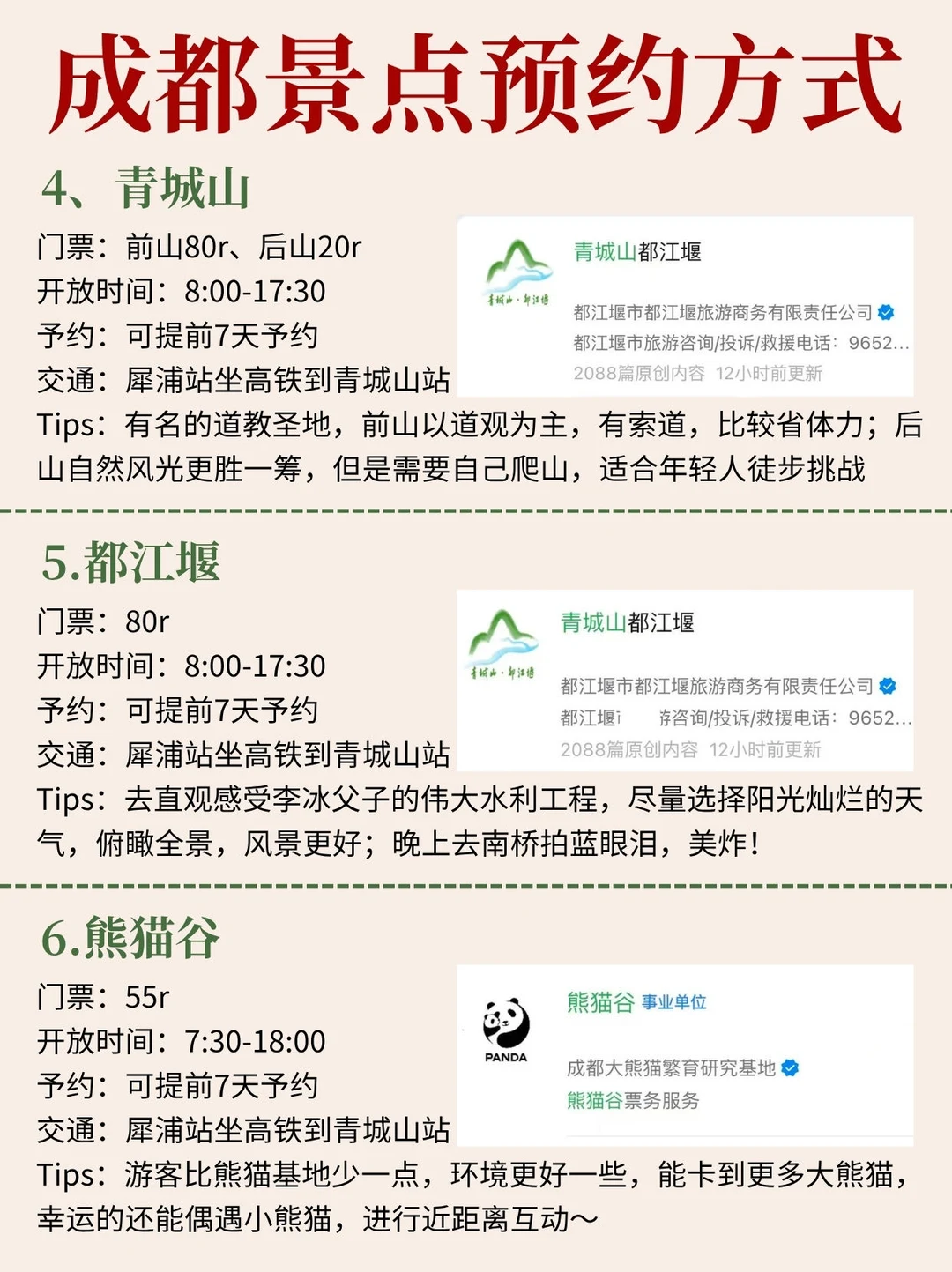 ➎都江堰:可提前7天予约,8:00-17:30
