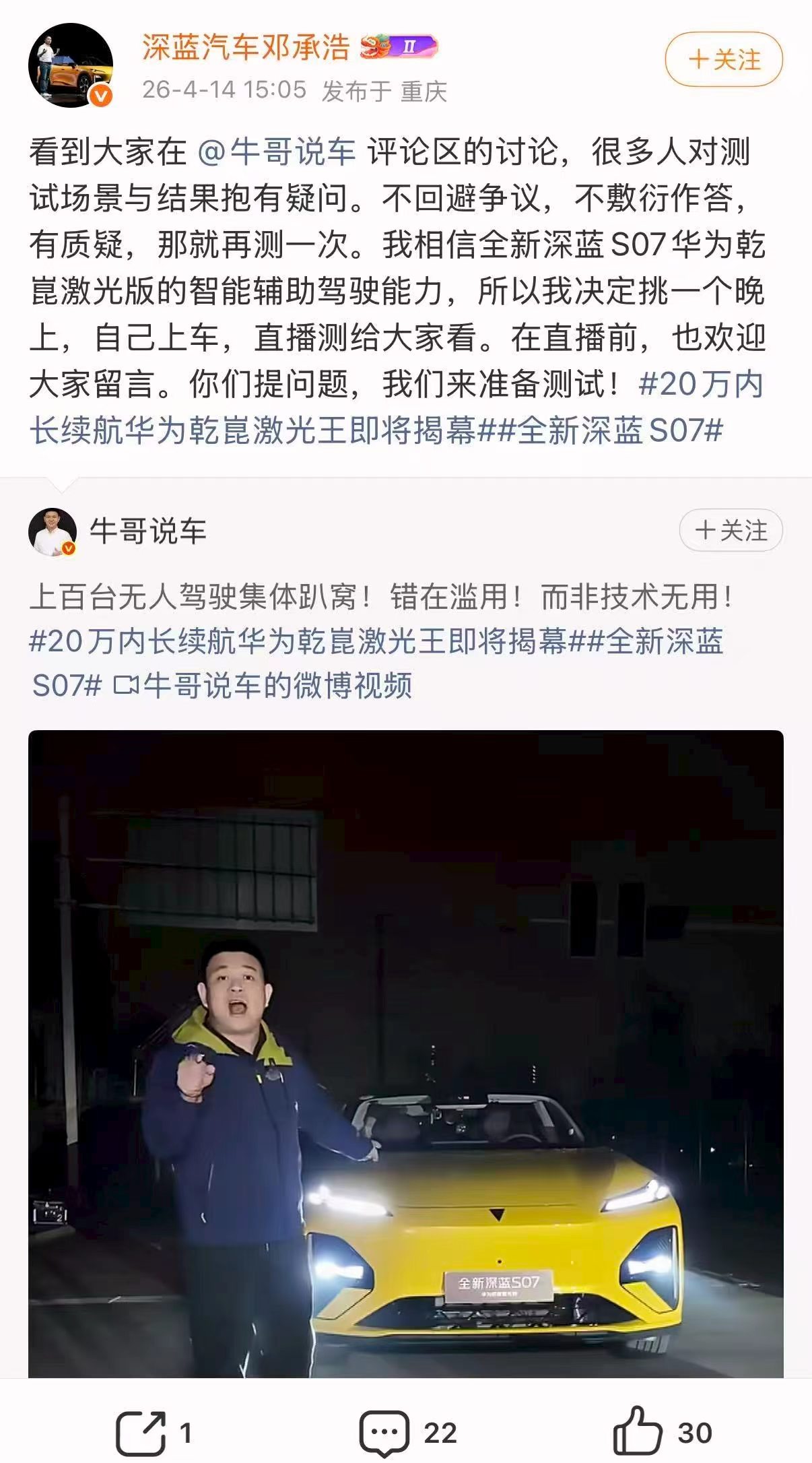 最近的深蓝S07测评引发网友质疑讨论后,邓承浩没有用公关话术打太极,反而直接宣布直播实测,亲自开车给大家看智驾在复杂场景下的完整表现。