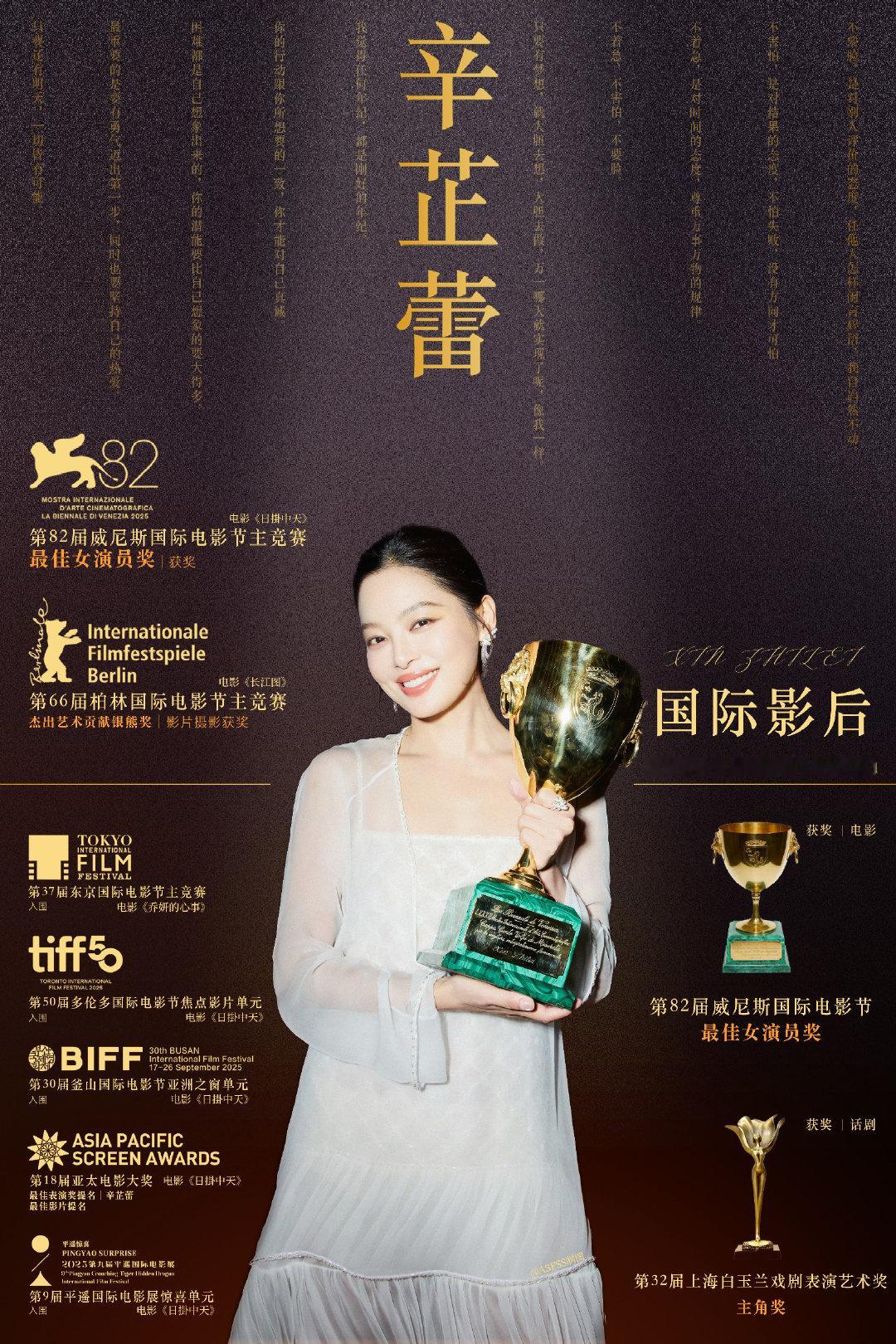 辛芷蕾实绩完全是赛级的,问把职业生涯各个领域都拉到顶是一种什么体验,请看👇曝好几位艺人不甘被辛芷蕾压一头 1⃣️入行以来主演三部文艺片,部部入围国际电影节主竞赛单元:第一部女主电影《长江图》入围第66届柏林国际电影节主竞赛单元;第二部主演电影《乔妍的心事》入围第37届东京国际电影节主竞赛单元;第三部一番女主电影《日掛中天》入围第82届威尼斯国际电影节主竞赛单元并一举拿下最佳女演员奖,成为华人影坛第三位获此殊荣的国际影后; 2⃣️第一次演话剧勇挑独角戏,凭借《初步举证》中文版获得第32届上海白玉兰戏剧表演艺术奖主角奖; 3⃣️主演电视剧《仁心俱乐部》《女神蒙上眼》收视稳居卫视第一。 在影后冠冕后的大半年里,实绩更是再上一层: 4⃣️2025金九银十连续刷新封面,刷新五大女刊二轮满贯最快纪录,登封国家级权威刊物《人民画报》、法国《Le Point》大街小巷刷脸;新增多个高title代言; 5⃣️重量级活动身影频现,金鸡节颁奖嘉宾、2026中法文化之春宣传大使、首届CMG中国电影盛典宣传大使。 姐的事业心是蓬勃的、成绩是顶级的、实力是有口皆碑的👍👍👍