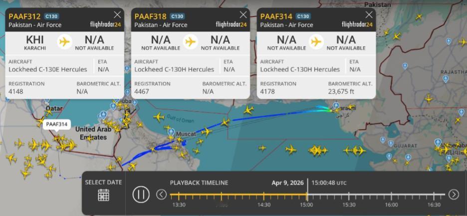 2026年4月9日,巴基斯坦空军的伊尔-78MP加油机和C-130H运输机出现在波斯湾空域,部分飞机往返于沙特方向。巴基斯坦方面证实,空军出动了JF-17枭龙战斗机、ZDK-03预警机及多架运输机参与中东任务。与此同时,大型军用运输机持续向沙特运送物资,外界普遍研判这正是防空系统的补给运输。