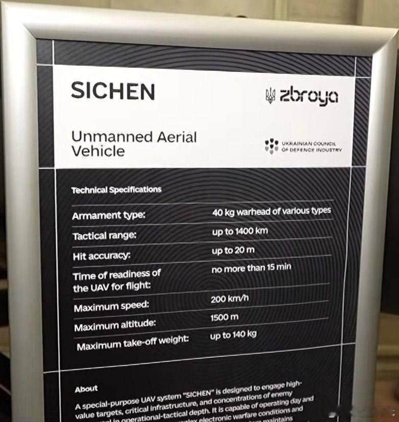 乌克兰远程无人机“Sichen”在乌克兰国防工业工人日专题展览上展出。战斗部重量:40公斤。飞行射程:最远1400公里。关注俄乌局势最新进展俄乌冲突普京宣布停火32小时
