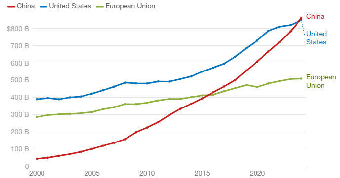 另据美国大学协会网站3月份消息,根据OECD的评估指标,2024年,中国在研发领域的总投资额(按当前美元价值计算)达到1.03万亿美元,超过了美国的1.01万亿美元。