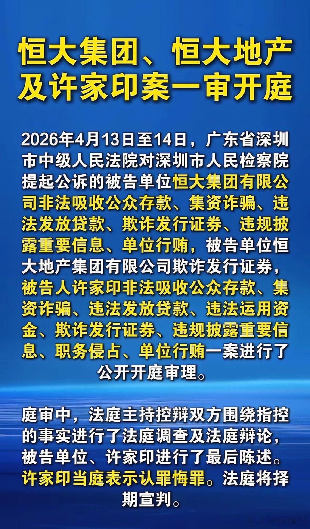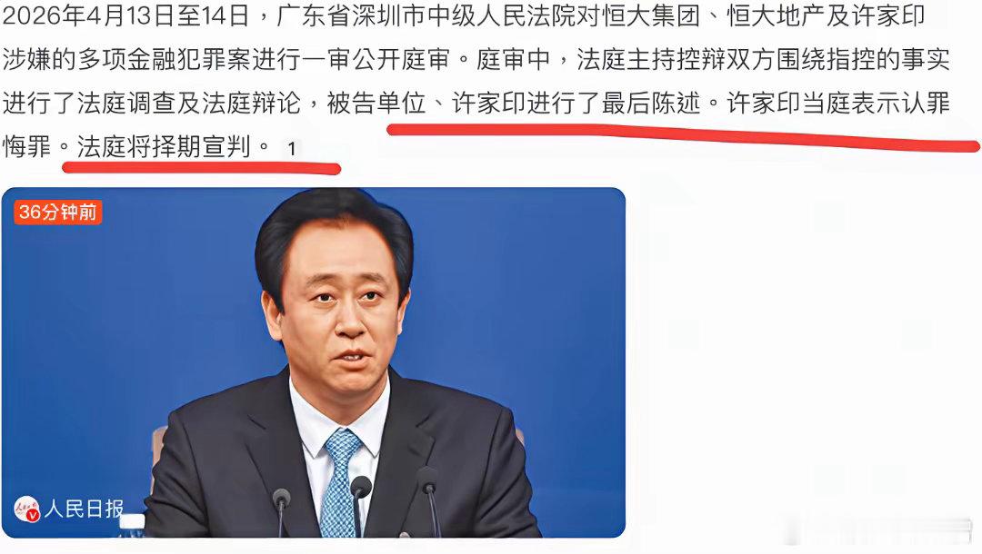 2026年4月13-14日,许家印因涉嫌多项经济犯罪在深圳中院受审,庭审中他当庭认罪悔罪,法庭将择期宣判。此前恒大暴雷,总负债达2.4万亿。许家印曾与前妻“技术性离婚”,其携500亿资金赴英定居。然资产遭全球冻结,每月仅领18.6万生活费,次子亦被抓。前高管夏海钧亦携600亿跑路,巨额资金去向及追回成焦点。
