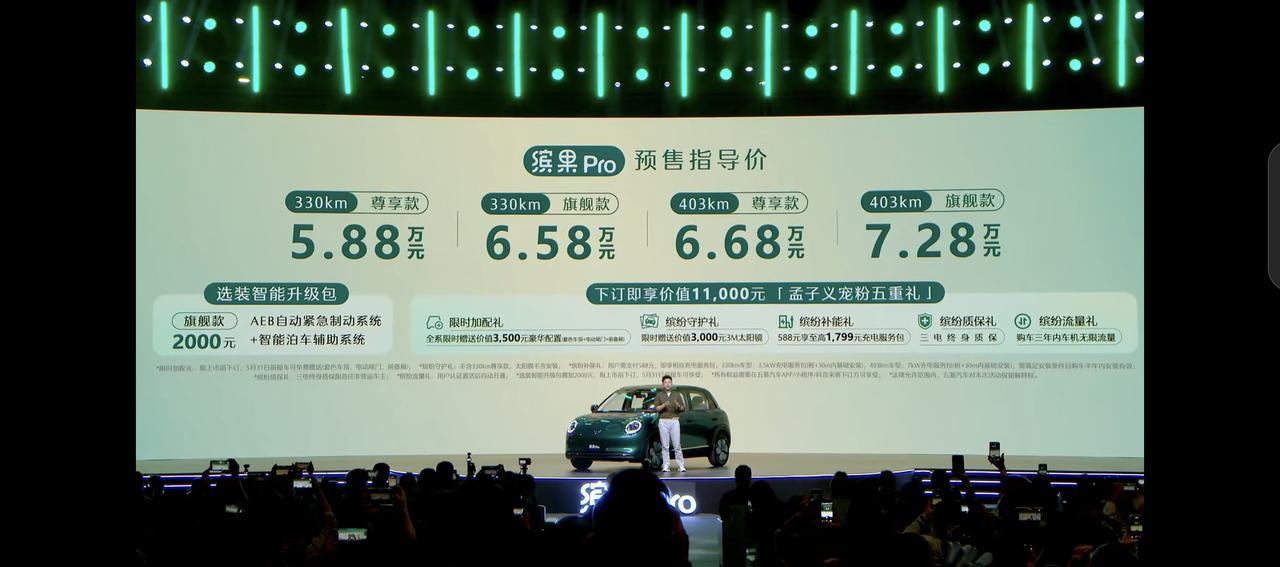 缤果 Pro 预售价5.88万~7.28万元。续航版本:330km/403km(电池包 31.9度/37.9度) 。3C 快充,30-80%用15分钟,支持家充,快充和慢充。这次升级了液冷电池,3.3kW的外放电,尺寸4050×1758×1580毫米,轴距 2560毫米,半隐藏门把手,尾门支持语音和车机双控,后备厢标准容积 380升,新增30升前备厢。车内12.8 英寸中控屏和8.88英寸仪表。A0纯电的赛道其实也挺卷的,除了价格要足够低,配置还不能将就。缤果Pro算是最早一批的纯电代步车,颜值算是个特点,也想走走时尚年轻路线。这次的预售价和配置,大家觉得在目前的市场环境下有的打吗?【来自懂车帝车友圈】