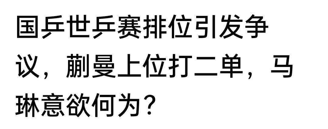 黑子粉们点评了钱天一的论文,又开始叨叨蒯曼在伦敦世乒赛打二单的问题了!! 蒯曼在伦敦世乒赛打二单是真是假,不得而知,但黑子粉们现在不淡定了,叽歪乓协团队的安排了,说为什么不让王曼昱打二单,而安排蒯曼打二单,王曼昱是不是边缘化了,宣传海报都将王曼昱安排在边上了!! 其实这样安排更好,孙颖莎打1单,能确保1分,二単蒯曼得不得分是次要的,主要是对蒯曼起个大赛的锻炼作用,王曼昱三单得1分,若果二单蒯曼没得分,打四单的孙颖莎是不是休息的时间更长一些,这第三分就有保证了么,王曼昱的身体健康状况能在短时间内打两场么!! 黑子粉现在对乒协的什么事儿都要吹毛求疵,大加议论一番!钱天一的论文,说了个教练对不同的运动员采取不同的训导方式,因人施教,本来是好事儿,可到了黑子粉嘴里就成坏事儿了!!!!