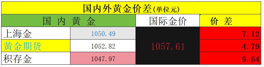 4月14日, 国内外黄金强势运行, 齐刷刷上涨。 上海金收盘于1050.49元, 国内黄金期货收盘于1052.82元, 民生积存金报价1047.97元。 国际金价报价4795.7美元, 简单折算成人民币就是1057.61元。 国内外黄金是有一定价差的。 通过下面的对比图, 国际金价最强, 民生积存金最弱。