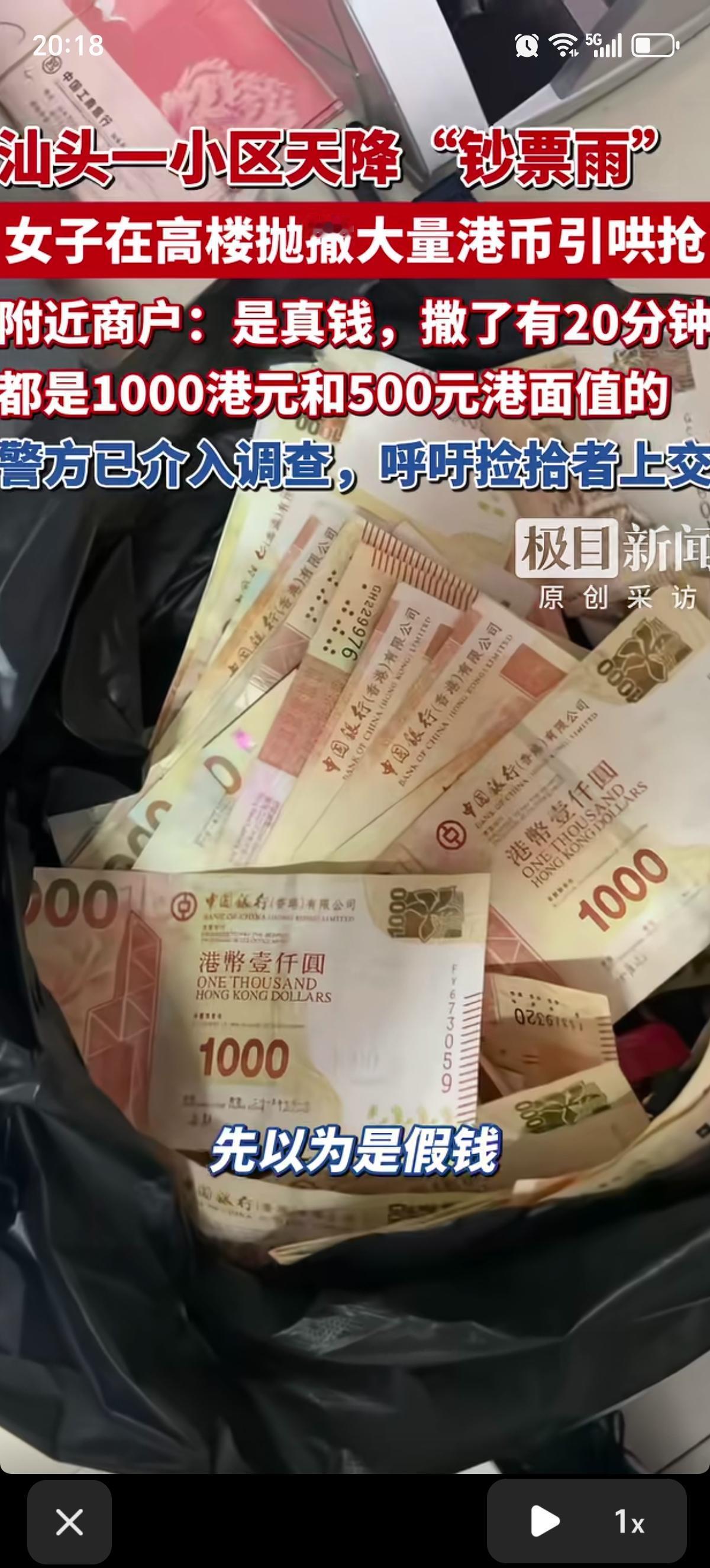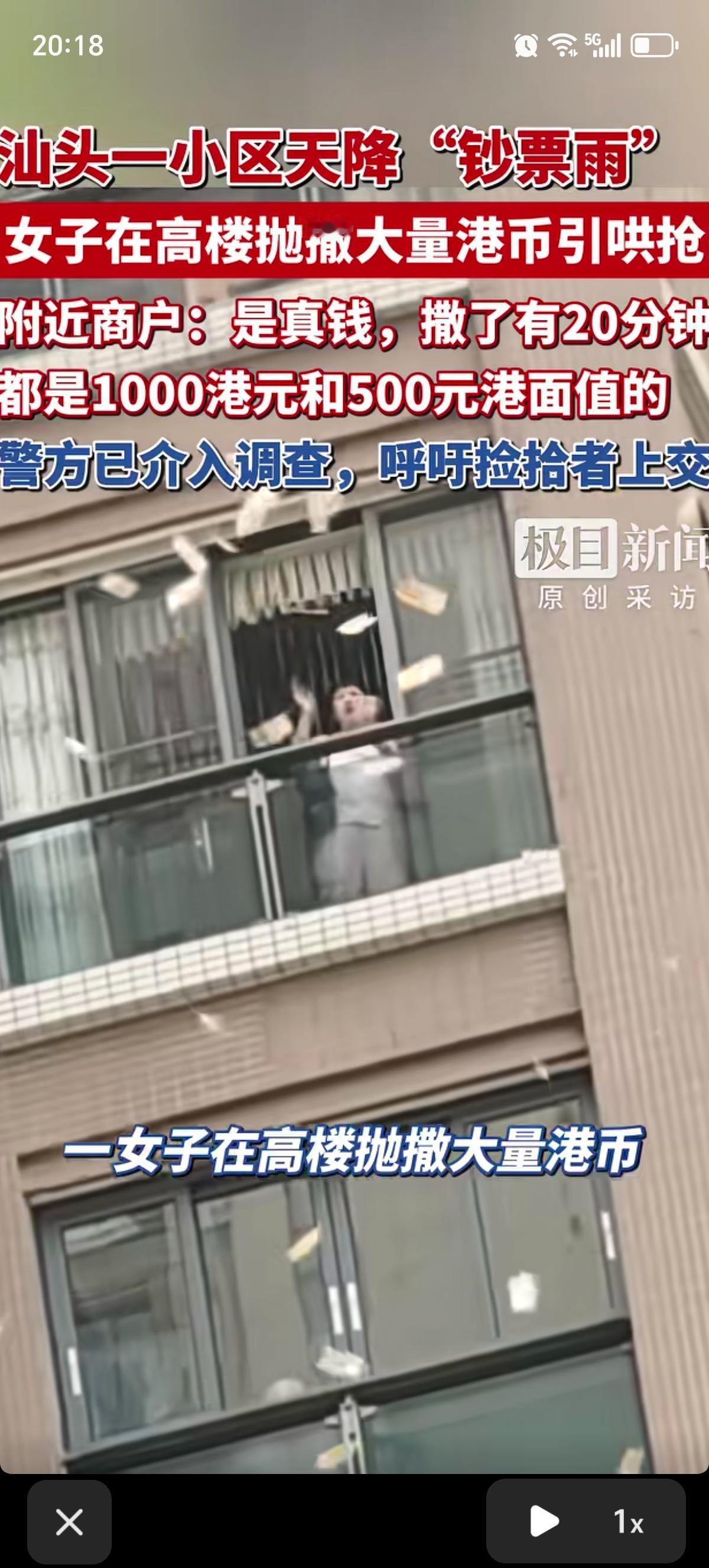 高空抛物,拿钱砸人,看到真的了。广东汕头一小区女子十分豪横的顺着窗户往外撒钱,底下的围观群众就痛苦了,都是500到1000元的真钱啊!辛辛苦苦捡了20分钟,女子在努力在上面撒钱,底下的人在努力捡钱。 最后的结果是很多人都不太开心,到手一把的钞票还得内心哭唧唧、面带笑容的给人家送回去。