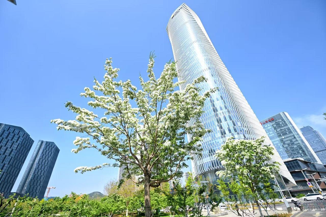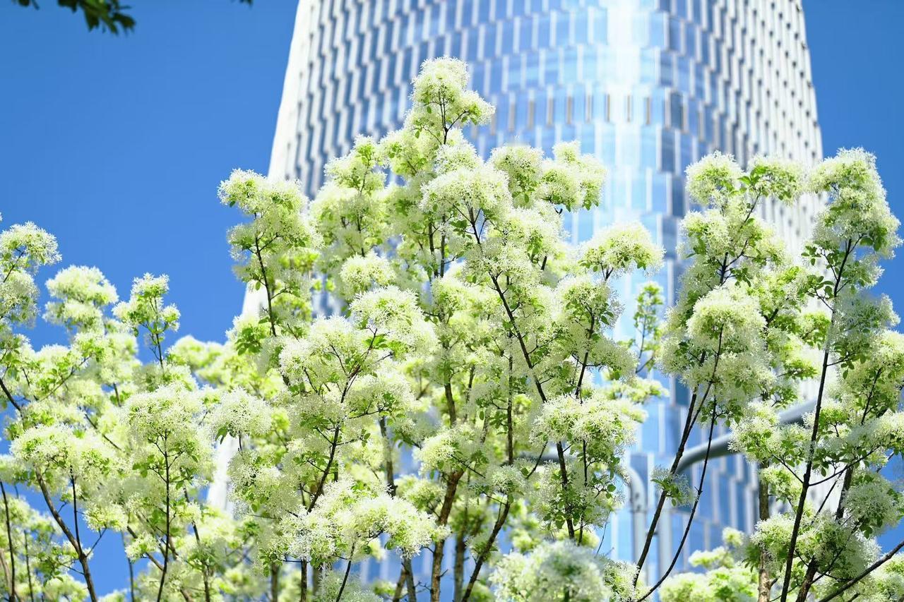 4月14日,在济南中央商务区荷花湖东侧,道路两旁种植的流苏树已迎来盛花期,如覆春雪,白花随风飘荡,犹如一条条白色的绸缎舞动,成为济南CBD绸带公园内一道亮丽的风景线。详情阅读>>-app/#/content?catid=39&id=5243122(LY)