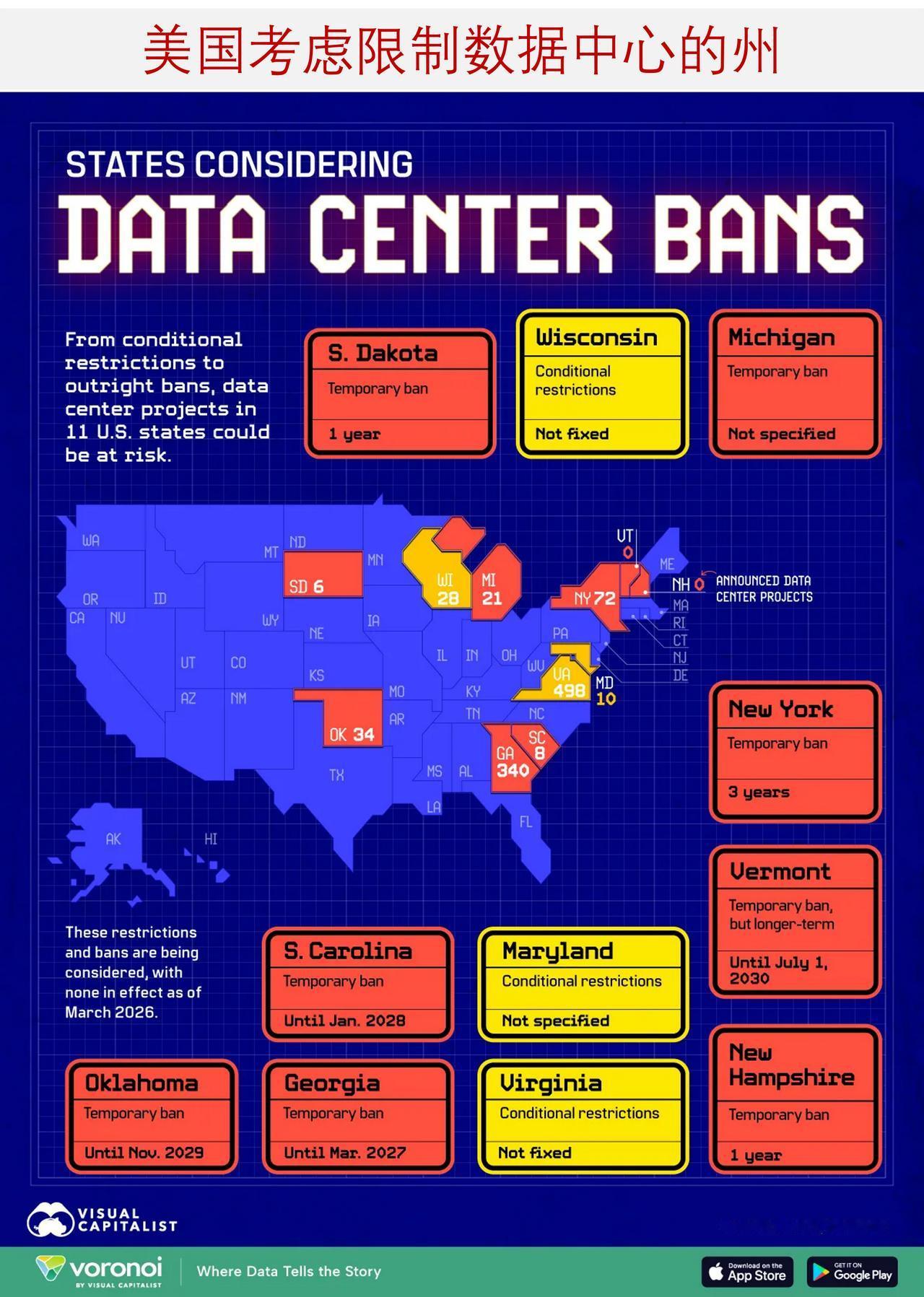 美国各州纷纷出台限制数据中心政策,这是为什么? 数据中心在美快速扩张之际,越来越多州正考虑出台相关限制措施。 下面图表梳理了美国各州针对新建数据中心提出的限制提案,以及各州已公布的数据中心项目数量。相关数据分别来自Stateline与Aterio。 ——美国考虑限制数据中心的地区 在计划限制或禁止建设数据中心的美国各州中,多数拟推行临时禁令,另有三个州计划实施有条件限制。 弗吉尼亚州是数据中心建设热点地区,全球70%的互联网流量经该州北部传输。随着该州计划再建498个数据中心,这一规模还将大幅增长。 但这一高速扩张也引发部分政策制定者反对,弗吉尼亚州正考虑对数据中心实施有条件限制,可能使上述拟建项目面临风险,相关限制将与能耗使用挂钩。 佐治亚州已有340个拟建项目,该州提议在2027年3月前暂停审批新项目。 纽约州(72个拟建项目)与俄克拉荷马州(34个拟建项目)计划暂停新建工程,同时开展研究, 全面评估数据中心的能源需求、土地使用及综合影响。纽约州的暂停期或长达三年,俄克拉荷马州则可能持续至2029年11月。 威斯康星州也计划禁止新建数据中心,除非立法机构出台消费者保护措施,例如出台法规避免水电成本转嫁至居民。该州已有约28个拟建项目。 密歇根州有21个拟建项目,相关提案将禁止新建数据中心,并取消该行业相关的自主激励政策。 马里兰州要求,新建数据中心必须先通过专项立法,规定数据中心需与发电设施配套建设,否则将禁止施工。该州有10个拟建项目。 —— 各州对数据中心采取预防性措施 即便拟建项目数量不多的州,也在采取预防性举措。 南达科他州有6个拟建项目,已提出为期一年的临时禁令,暂停数据中心建设与扩建。 南卡罗来纳州有8个拟建项目,计划在2028年1月前停止发放许可与激励补贴。 佛蒙特州拟推行的禁令时长位居前列,将持续至2030年,且专门针对人工智能数据中心;新罕布什尔州则计划自政策生效起实施为期一年的临时禁令。两州目前均无拟建数据中心,但都将开展影响评估研究。 上述限制措施目前均处于各州审议阶段,尚未正式通过。 ——数据中心热潮带来的影响日益凸显 多数拟出台的限制措施,旨在暂停建设并评估数据中心从能源消耗到居民成本上涨等多方面影响。此前,受数据中心影响或邻近数据中心的社区反对声浪持续高涨。 在州政府未采取行动的地区,地方政府已率先出手。例如,印第安纳州怀特县早在去年10月就自行出台了新建数据中心禁令。