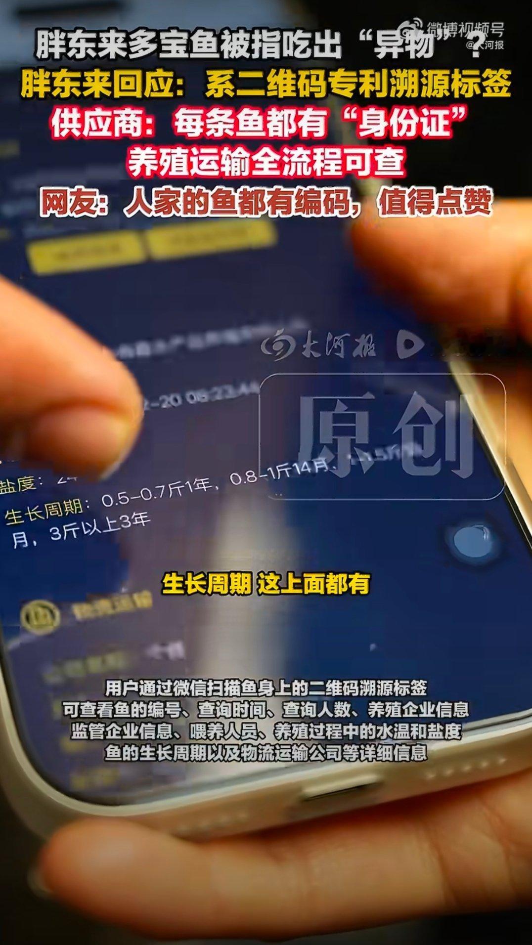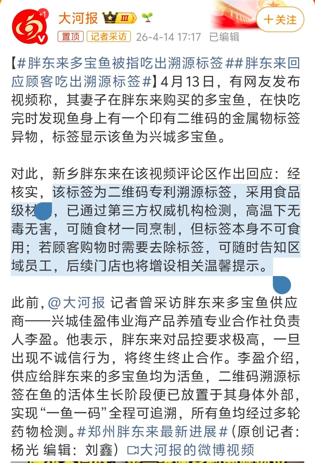 胖东来多宝鱼被指吃出溯源标签溯源标签可太常见了,阳澄湖大闸蟹每一只都有溯源标签,也没见谁说过什么不合适,如果商家敢私自去掉指定被说成螃蟹有猫腻,怎么到了胖东来的多宝鱼就成了异物,还是说买的时候被鱼吃肚子里了没看到,做熟了才发现~