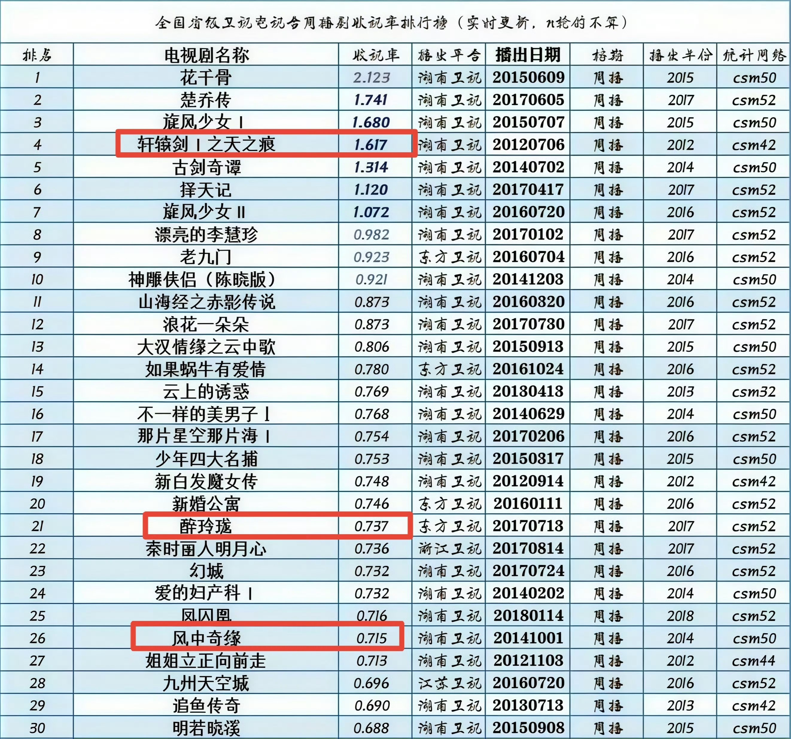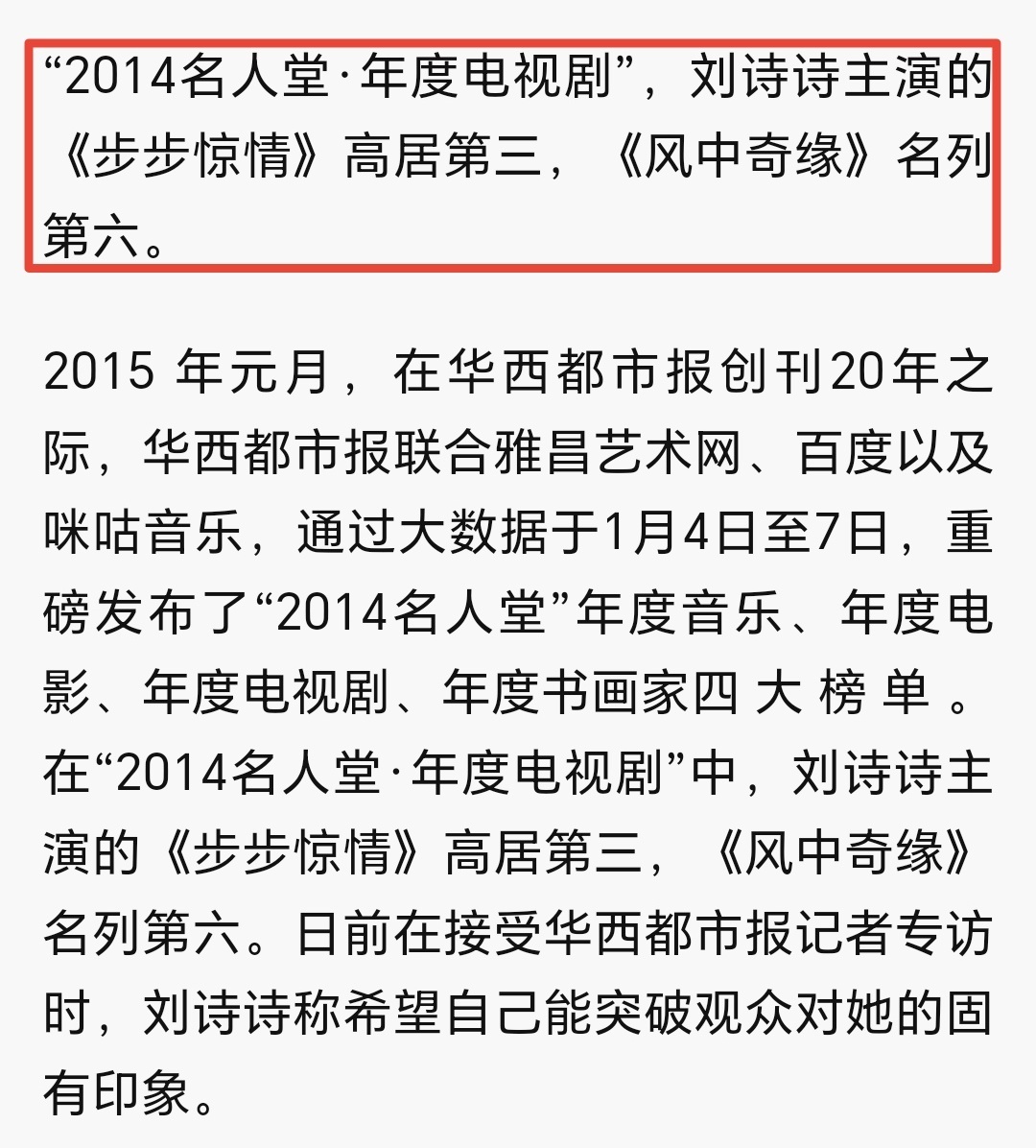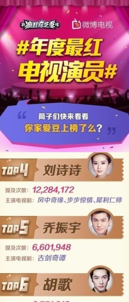 最近风中奇缘切片又开始大爆特爆了,所以再发一下当年实绩吧风中奇缘首播破一,平均收视率0.82,周播档年季网播量集均破亿,年度TOP8微博古装电视剧提及度TOP2 刘诗诗获得微博年度最红电视演员TOP4刘诗诗获百度年度人气女神TOP1