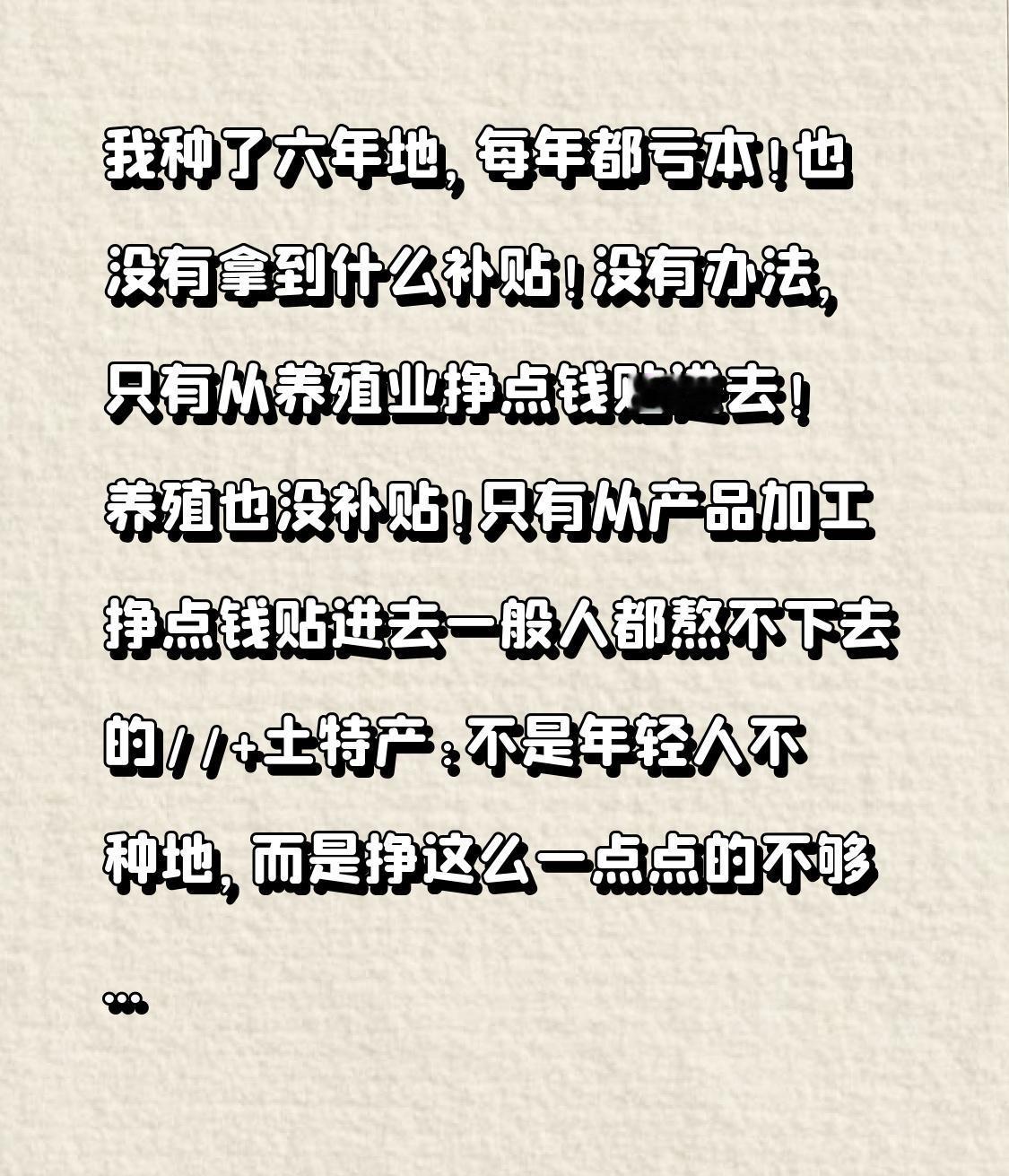 我种了六年地,每年都亏本!也没有拿到什么补贴!没有办法,只有从养殖业挣点钱贴进去!养殖也没补贴!只有从产品加工挣点钱贴进去[笑哭]一般人都熬不下去的//@江西光头哥+土特产:不是年轻人不种地,而是挣这么一点点的不够生活!种粮大戸拿大补贴目的不纯!国家应该给我们配置耕着农具,种田的问题,基本上就解决了