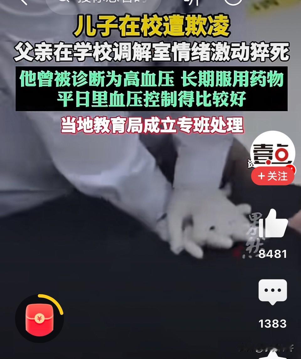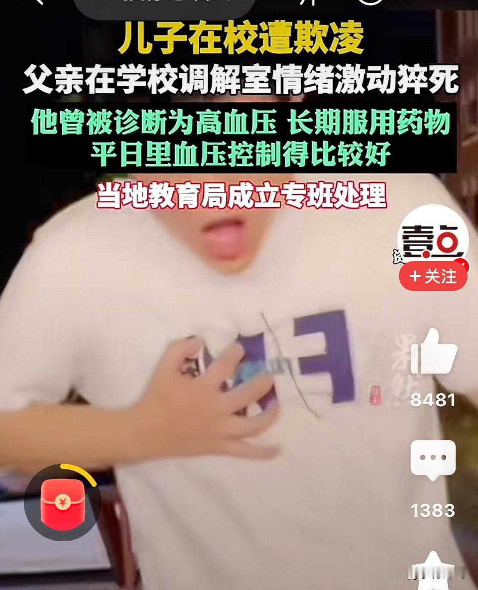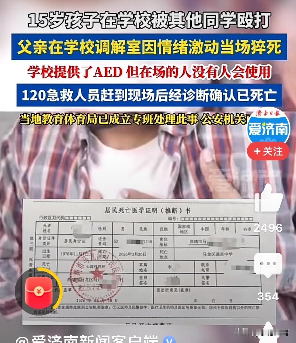 “太悲剧了!”云南曲靖,女子称丈夫得知儿子被欺凌,情绪激动猝死在校调解室!女子:“他患有高血压,长期服用药物”平日里血压控制得比较好,就是受不了孩子被霸凌……”网友:被霸凌还没了爸爸,这孩子可怎么办呀! 据学生母亲李女士反映她的49岁丈夫接到孩子班主任老师的电话,称孩子在学校被其他同学殴打,需要家长到学校调解,到学校后,丈夫得知了孩子被其他学生欺凌的经过,在学校调解室因情绪激动当场猝死,目前丈夫还未安葬。 原来,当天接到老师电话后,下午5时许,她和丈夫进入通泉中学。 进校后我们得知15岁儿子从这个学期一开始就被其他同学索要零食,之后被索要钱财,3月30日下午被同学殴打。 孩子爸爸知道孩子被欺凌的经过后情绪很激动。随后与孩子、、妻子班主任和另一方学生家长进入调解室由班主任进行调解。没想到进入调解室,不到6分钟后就发生意外。 当地教育部门回应称已经成立专班处理此事,关于家长反映的学生在校被欺凌以及家长在校调解时猝死的情况,当地公安机关已介入调查。 此事发生后引发网友热议,有的网友说,校园霸凌是一个及其普遍和严重的现象,霸凌者不入刑,家长不巨额赔偿,老师不承担责任是解决不了问题的。 也有的说,一旦有校园霸霸,先撤校长再撤教育局长,然后开除涉事学生,保证再没有什么校园凌霸。 还有的说,我哥哥的朋友家娃儿上初中,前段时间被学校七个同学霸凌,他妈很厉害,拿着大喇叭,学校教育局派出所到处闹,然后让孩子住院不准出院,霸凌学生家长都给她跪下,怕她不松口孩子在留下案底,最后结果是一个孩子赔了2万,总共赔了十四万,这事儿结束了。 一个家庭,因为一次校园冲突,彻底垮了霸凌的拳头只打了一下,但倒下的,是一个家庭的顶梁柱。 这件事里,打人的学生有错,对方家长有责,学校的调解机制有问题。 但最根本的问题是——我们从来没有真正把校园霸凌当回事。 “闹着玩”“小孩子不懂事”“道个歉就完了”……这些话,是不是特别耳熟?每一次校园霸凌事件,最后都走向“调解”。调解的本质是什么?是和稀泥。是让受害者“大度一点”,让施暴者“下次注意”。 可这一次,调解室里,一个父亲用命买了单。 写到这里,心里堵得慌。 那个15岁的孩子,以后的人生里,每一次想起爸爸,都会想起那间调解室。他可能会反复问自己:如果当时我忍一忍,不叫爸爸来,是不是爸爸现在还活着? 这个问题,没有答案。 但我们这些旁观者可以有一个答案:别再让家长替校园霸凌背锅了。打人,就报警;霸凌,就处分。别再把父母叫到调解室里,让他们替孩子“受刑”。 因为下一个倒下的,可能是任何一个孩子的爸爸。 --- 愿这位父亲安息。也愿那个15岁的孩子,能撑过这一生。