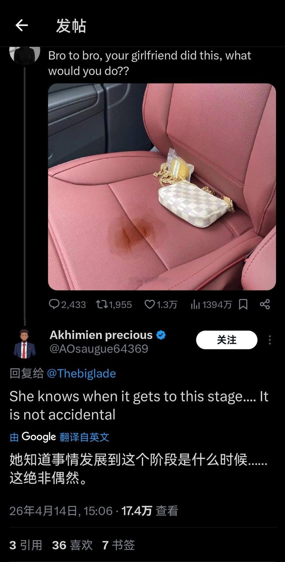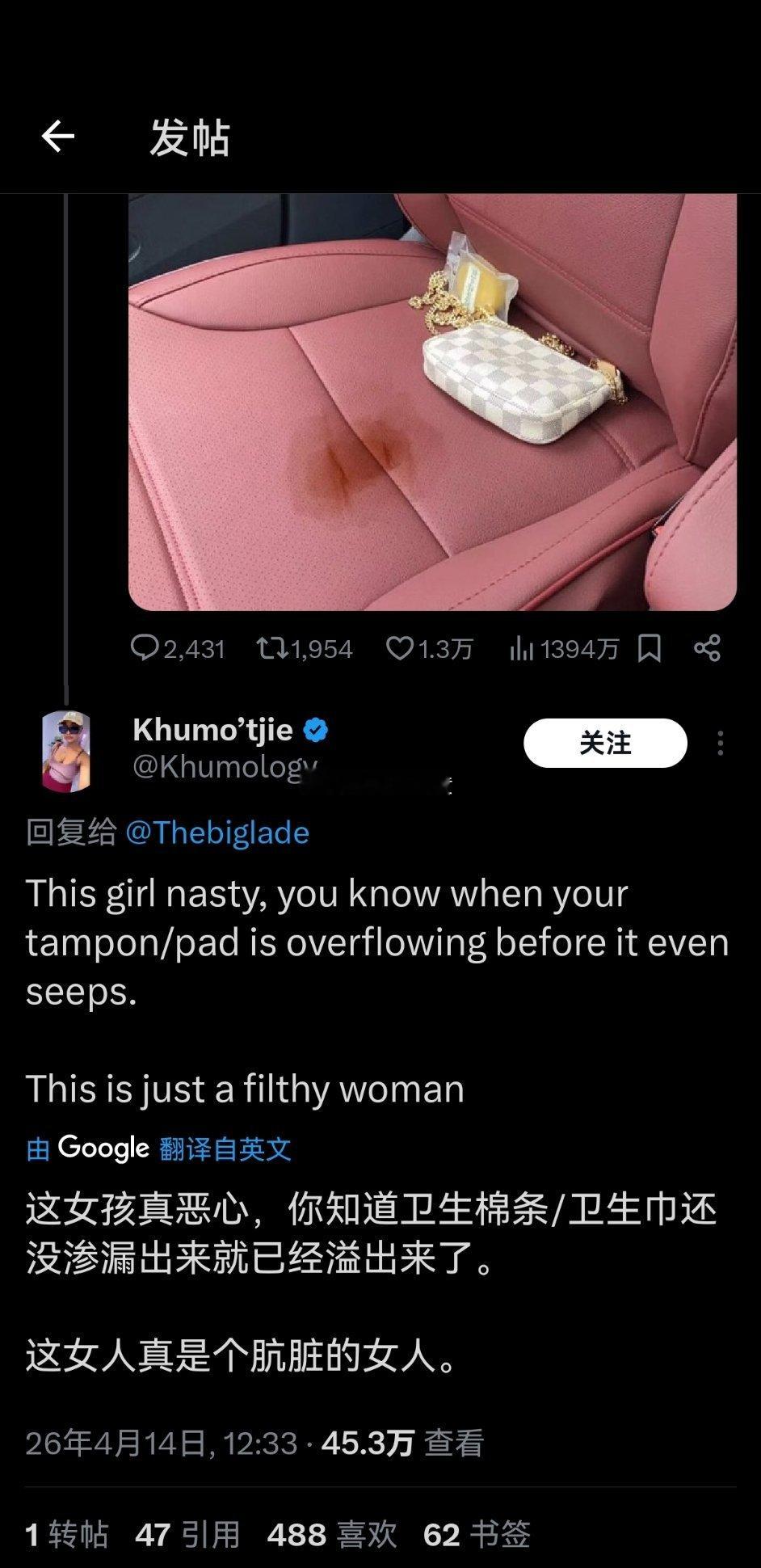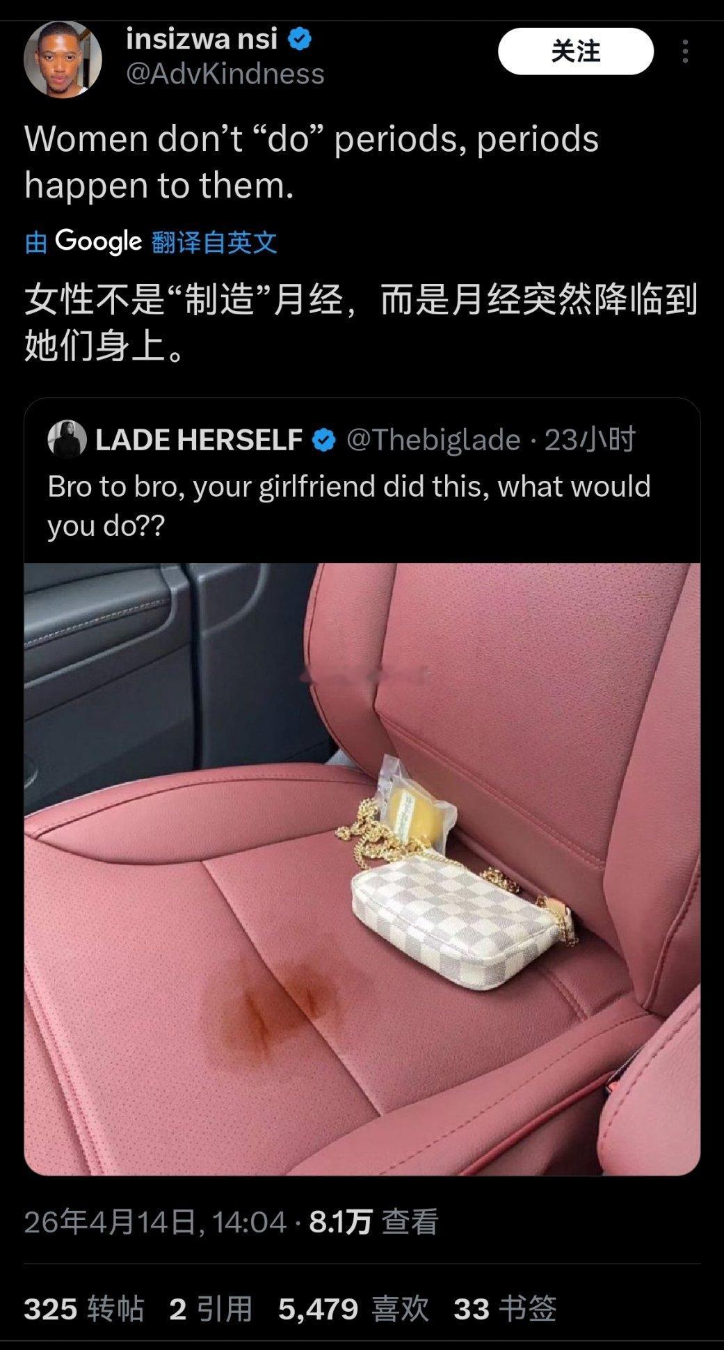 外网大热帖:欧美博主在网上求助,女朋友的月经弄脏了自己车的副驾,现在该怎么办?