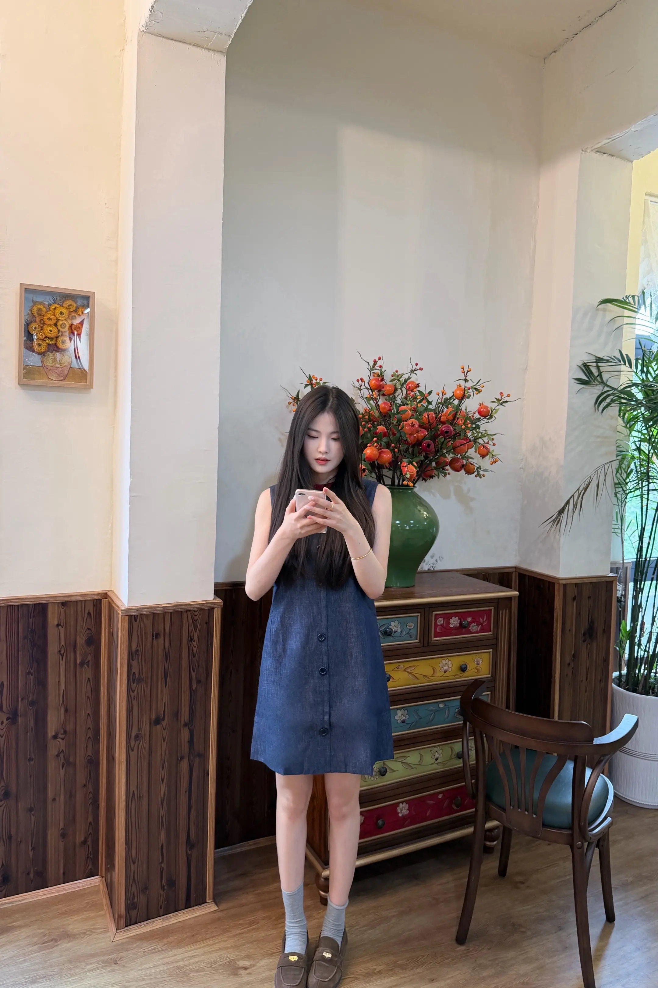 伊能静的儿子恩利再次穿起裙装,蓝色连衣裙搭配蓝色波点皮鞋,整体造型透着一股清新感